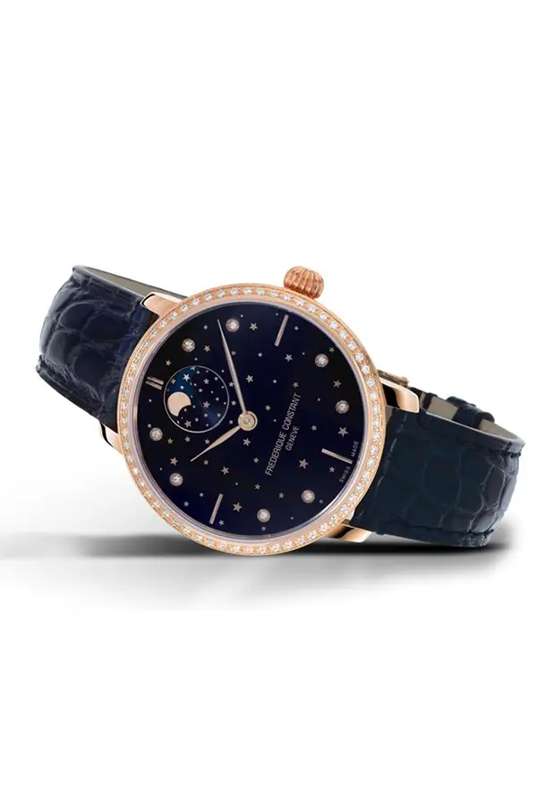 Die Modellreihe Frederique Constant Manufacture verwandelt luxuriöse Materialien in zeitlos elegante Uhren. Dieses Modell lässt sich vom Sternenhimmel inspirieren. Es fängt den Schimmer von Edelsteinen auf dem dunkelblauen Grund des Zifferblatts ein, der sich in der Lünette des vergoldeten Gehäuses wiederfindet. Die außergewöhnliche Verarbeitung ermöglicht ein klares Ablesen der Uhrzeit und zeigt auch die Mondphasen an. Die Uhr wird von einem Automatikwerk angetrieben.