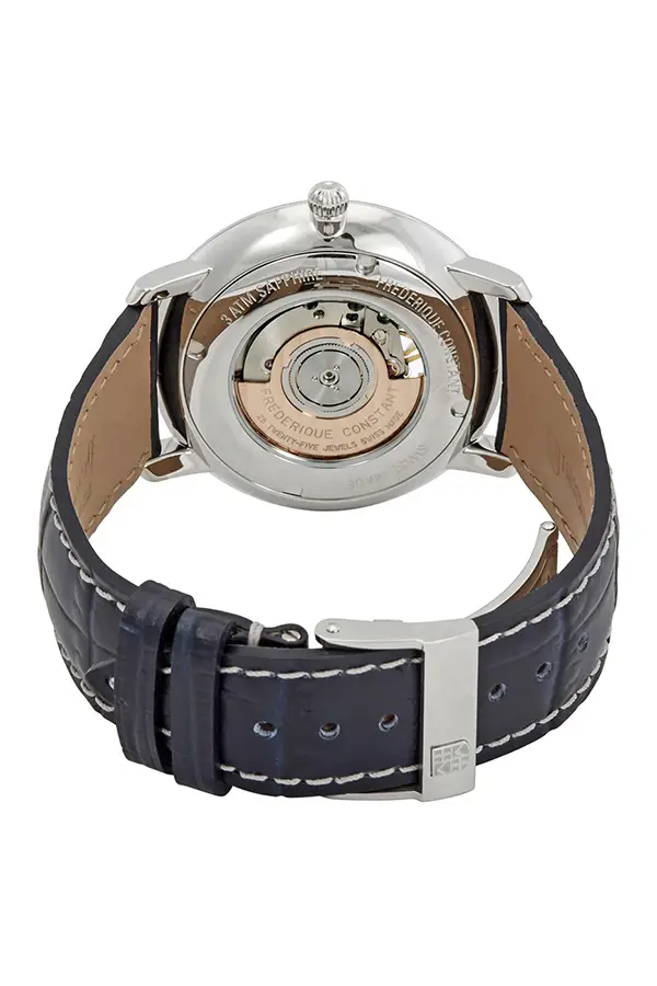 Frederique Constant lässt in seiner Slimline-Reihe zeitlose Eleganz erstrahlen. Diese Luxusuhr für Herren besticht vor allem durch ihren reizvollen Kontrast: Aus einem einheitlichen dunkelblauen Grundton tritt ein fantasievoll gestaltetes Zifferblatt hervor. Der Ausschnitt im Zifferblatt gibt den Blick auf das Herz der Uhr frei und ist das einzige dekorative Element. Gesteuert wird die Uhr zuverlässig von einem klassischen Uhrwerk mit automatischem Aufzug.