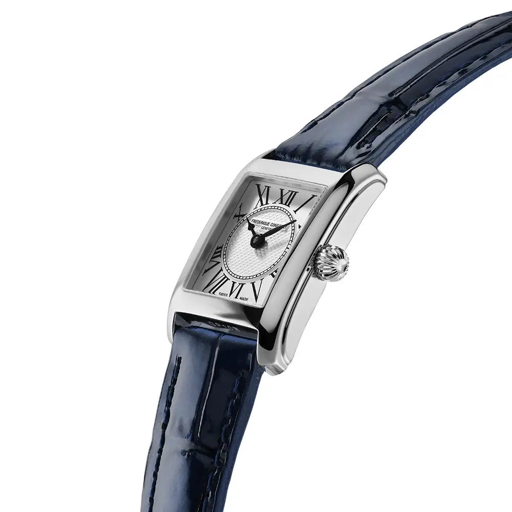 Die Frederique Constant Classics Carrée Ladies verkörpert zeitlose Eleganz, inspiriert von der traditionellen Schweizer Uhrmacherkunst. Das markante eckige Gehäuse aus Edelstahl verleiht der Uhr eine feine, feminine Ausstrahlung, während das klassische Zifferblatt mit römischen Ziffern und dezentem Guilloché-Muster ihren eleganten Charakter unterstreicht.