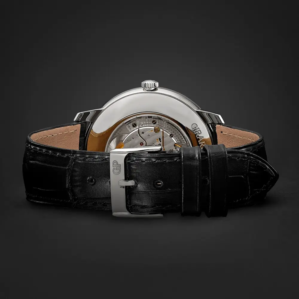 Das Design der Modelle ist klar und raffiniert - das dünne runde Gehäuse, das leicht gewölbte Saphirglas, die schmalen Indexe und die eleganten Zeiger schaffen eine ausgewogene und raffinierte Ästhetik. Im Herzen der Uhr ticken die eigenen Manufakturwerke von Girard-Perregaux, oft mit Komplikationen wie Datum, Mondphase oder Jahreskalender.