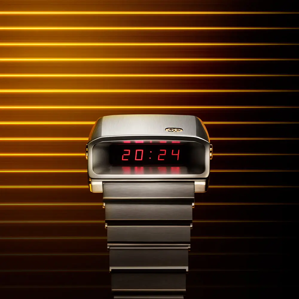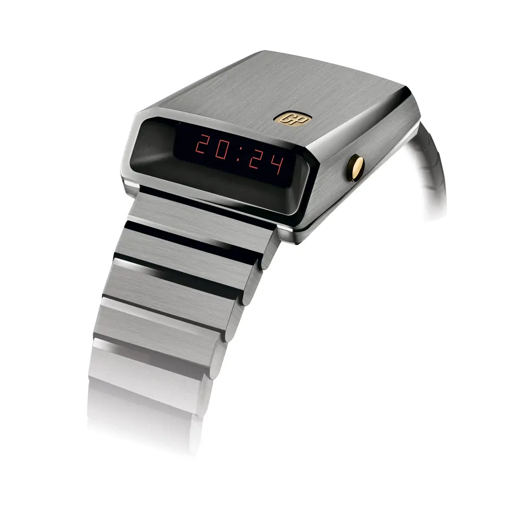 Das charakteristische rote LED-Display in Tunneloptik zeigt Zeit, Datum, Tag, Monat, Jahr, Chronograph und zweite Zeitzone sowie die spezielle „Secret Date“-Funktion. Im Inneren arbeitet das Quarzkaliber GP3980-1474, das höchste Präzision und Zuverlässigkeit bietet.