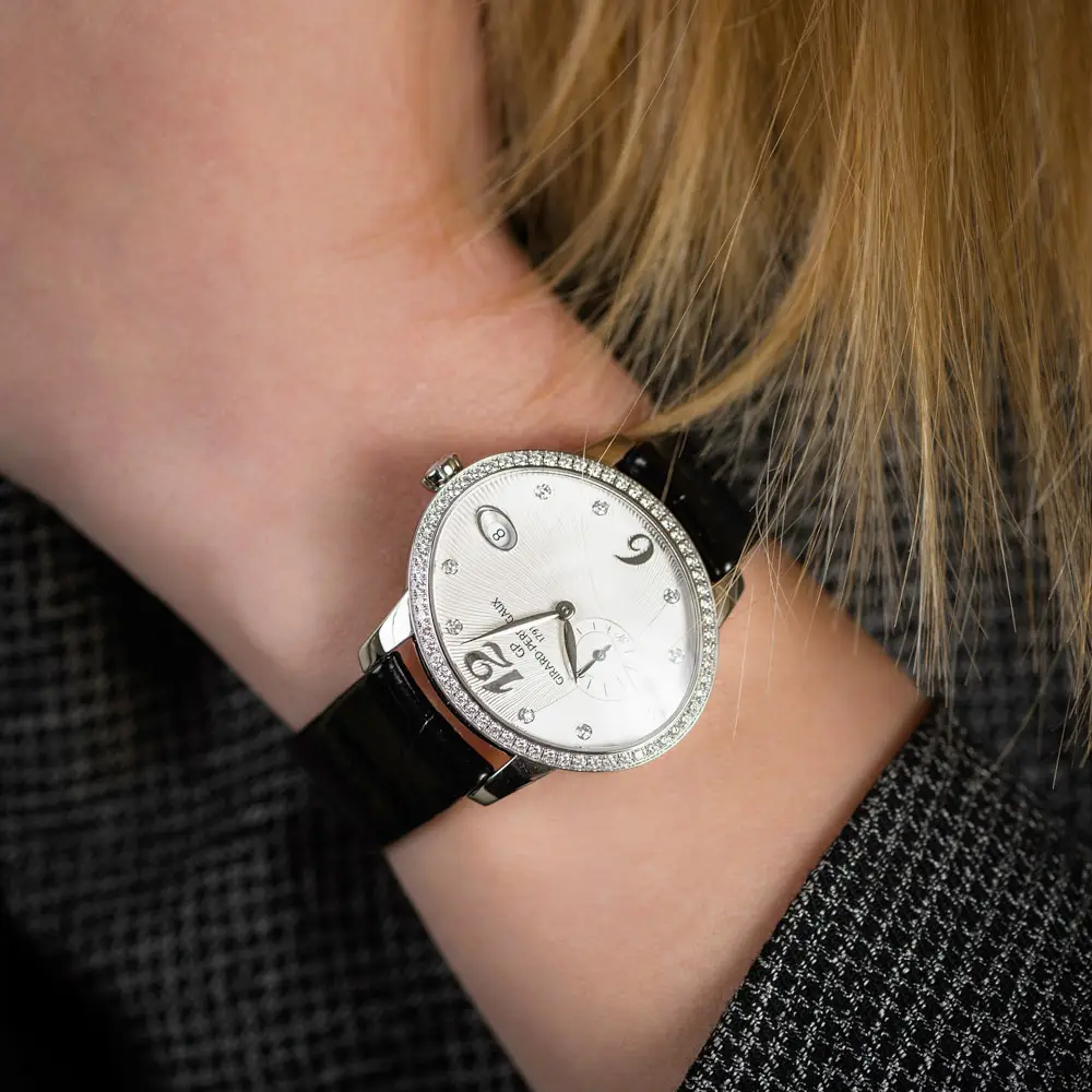 Die Girard-Perregaux Cat’s Eye besticht durch ihre anmutige Eleganz und ihr feines feminines Design, das luxuriöse Materialien mit präziser Uhrmacherkunst vereint. Das charakteristische ovale Gehäuse mit den Maßen 35,4 x 30,4 mm besteht aus hochwertigem Edelstahl und wird von einem robusten Saphirglas geschützt, das Langlebigkeit und hervorragende Ablesbarkeit gewährleistet.