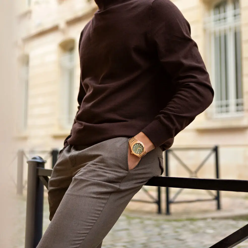 Eine Faltschließe aus Roségold gewährleistet sicheren und komfortablen Sitz. Dank der Wasserdichtigkeit von 5 ATM (50 Meter) eignet sich die Uhr für den täglichen Gebrauch und gelegentlichen Wasserkontakt.