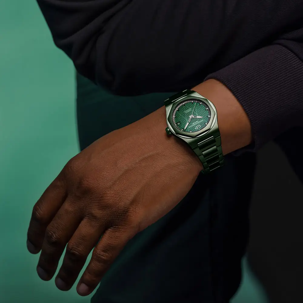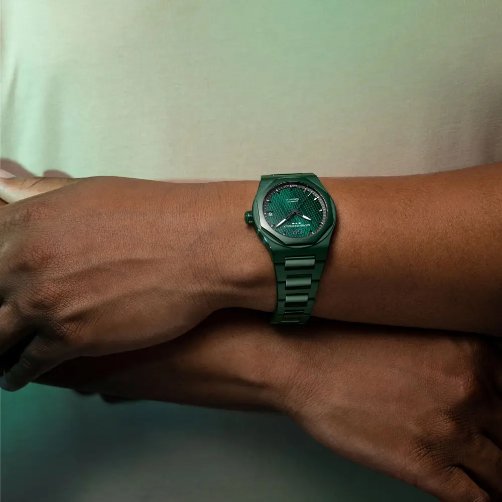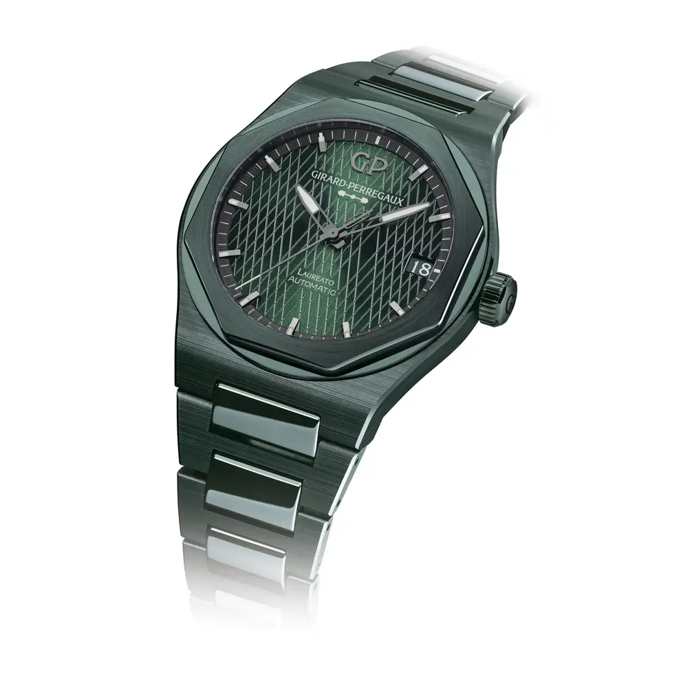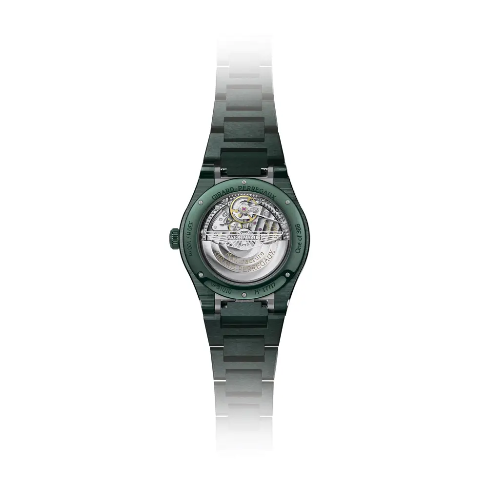 Angetrieben wird sie vom Automatik-Kaliber GP01800 mit 28.800 Halbschwingungen pro Stunde und 54 Stunden Gangreserve. Mit einer Wasserdichtigkeit bis 100 m (10 bar) und einer Limitierung auf 388 Exemplare steht die Laureato Green Ceramic Aston Martin Edition für technische Innovation und exklusives Design.