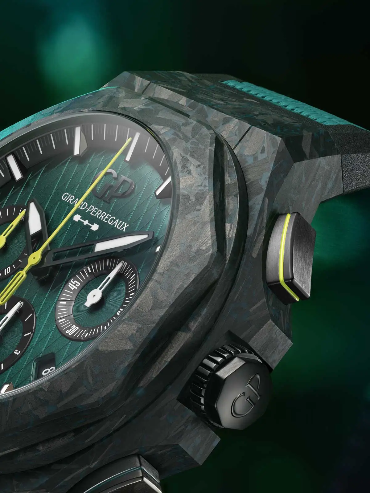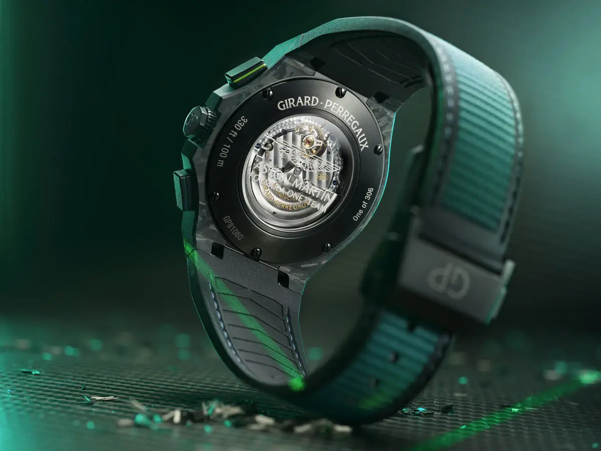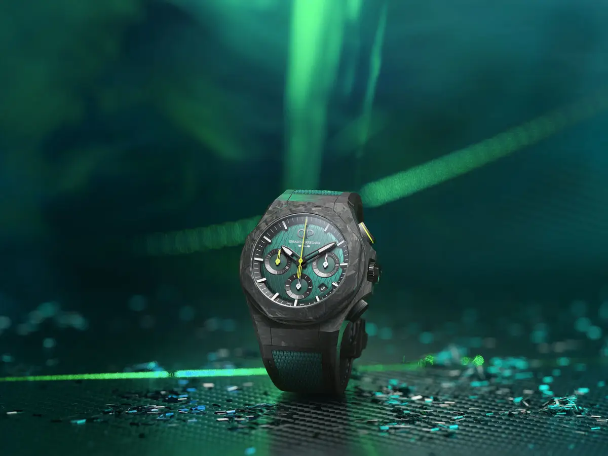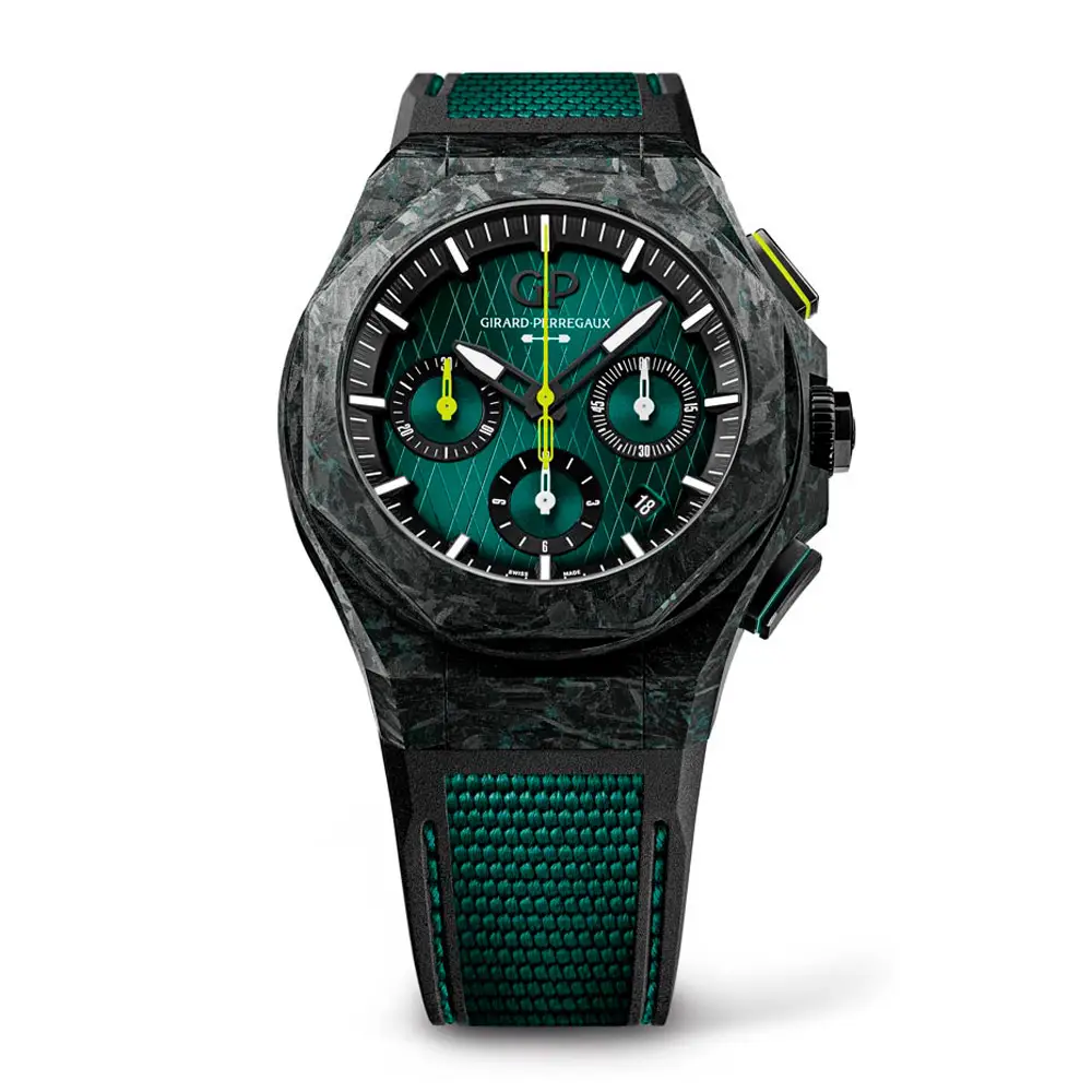 Die Girard-Perregaux Laureato Absolute Chronograph Aston Martin F1 Edition vereint Schweizer Uhrmacherkunst mit der Welt der Formel 1 in einer beeindruckenden limitierten Auflage von 306 Exemplaren. Ihr 44 mm Titan-Carbon-Gehäuse enthält Kohlefaser aus echten Aston Martin F1-Boliden der Saison 2021 und unterstreicht die technische Exklusivität und den sportlichen Charakter des Modells.