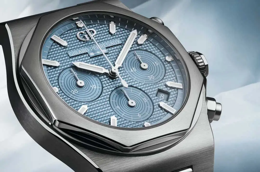 Die Girard-Perregaux Laureato Chronograph Ice Blue Uhr besticht durch sportliche Eleganz und präzise Schweizer Verarbeitung. Ihr markantes rundes Gehäuse mit einem Durchmesser von 42 mm besteht aus hochwertigem Edelstahl und wird durch ein robustes Saphirglas geschützt, das das wunderschöne blaue analoge Zifferblatt im ikonischen „Ice Blue“-Farbton bedeckt.
