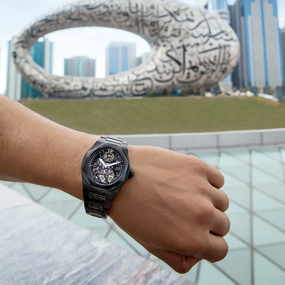 Unter dem Saphirglas offenbart das skelettierte Zifferblatt den manufaktureigenen Kaliber GP01800-0006, der mit 28.800 Halbschwingungen pro Stunde arbeitet und eine Gangreserve von 54 Stunden bietet. Jedes Detail des Uhrwerks ist fein vollendet und zeugt von höchster Uhrmacherkunst.