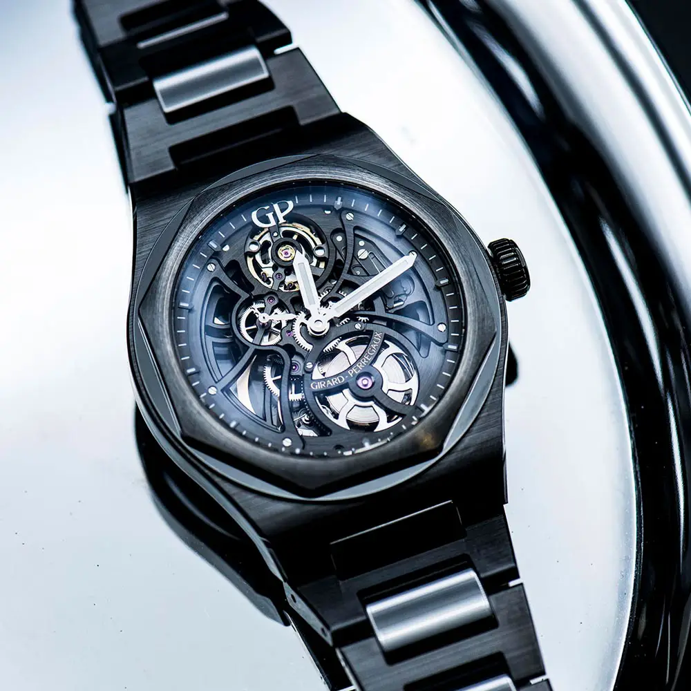Die Girard-Perregaux Laureato Skeleton Ceramic vereint moderne Ästhetik, technische Präzision und innovative Materialien in vollendeter Form. Ihr 42 mm großes Gehäuse aus schwarzer Keramik kombiniert satinierte und polierte Oberflächen und wird von der charakteristischen achteckigen Lünette ergänzt, die den sportlich-eleganten Stil der Laureato-Linie unterstreicht.
