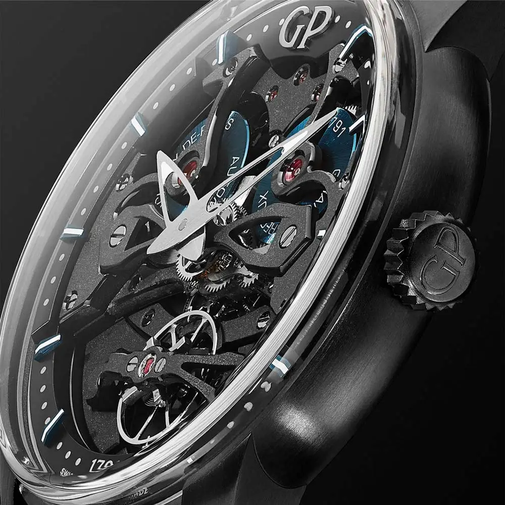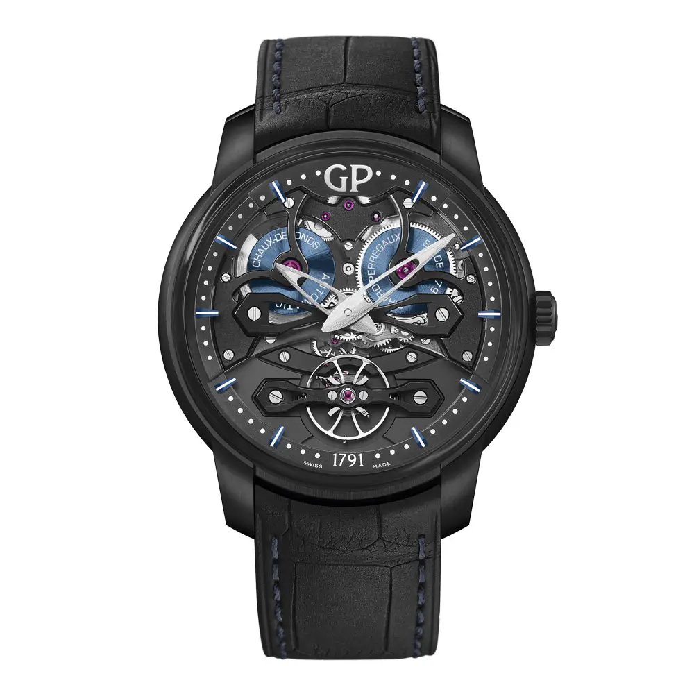 Unter dem Saphirglas arbeitet das hauseigene Kaliber GP08400 mit sichtbarem Mikrorotor, das mit 21.600 Halbschwingungen pro Stunde läuft und eine Gangreserve von 48 Stunden bietet – ein Ausdruck höchster Präzision und technischer Raffinesse.