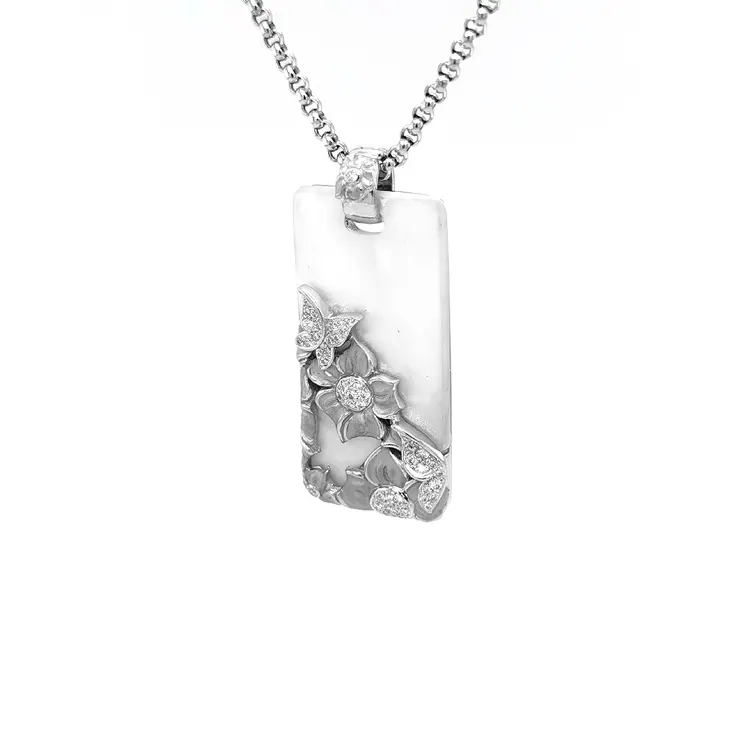 Im Zentrum des Designs befindet sich eine natürliche weiße Perlmutt-Einlage im Emerald-Schliff, die Sanftheit und Reinheit symbolisiert. Ergänzt wird sie durch 46 natürliche weiße Diamanten im Rundschliff (Round) mit einem Gesamtgewicht von 0,42 Karat und einer Größe von 0,90–1,60 mm. Diamanten der Farbe H und Reinheit VS sorgen für ein funkelndes Spiel des Lichts und unterstreichen die filigrane Struktur des Motivs.