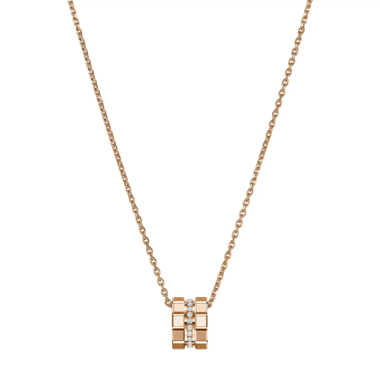 Der Chopard Ice Cube Anhänger 797005-5003 ist ein elegantes und modernes Luxusschmuckstück, das Minimalismus mit dem funkelnden Glanz von Diamanten verbindet. Dieses außergewöhnliche Schmuckstück wird meisterhaft aus 18-karätigem Roségold (750/1000) mit polierter Oberfläche gefertigt, wodurch der warme Farbton betont und ein Hauch von luxuriöser Raffinesse verliehen wird.