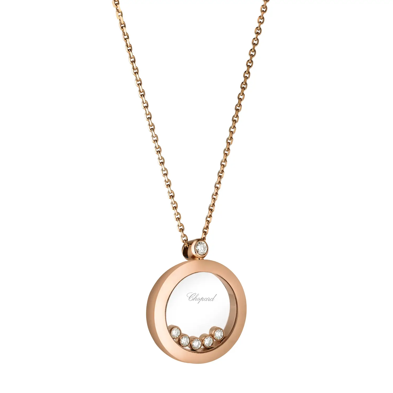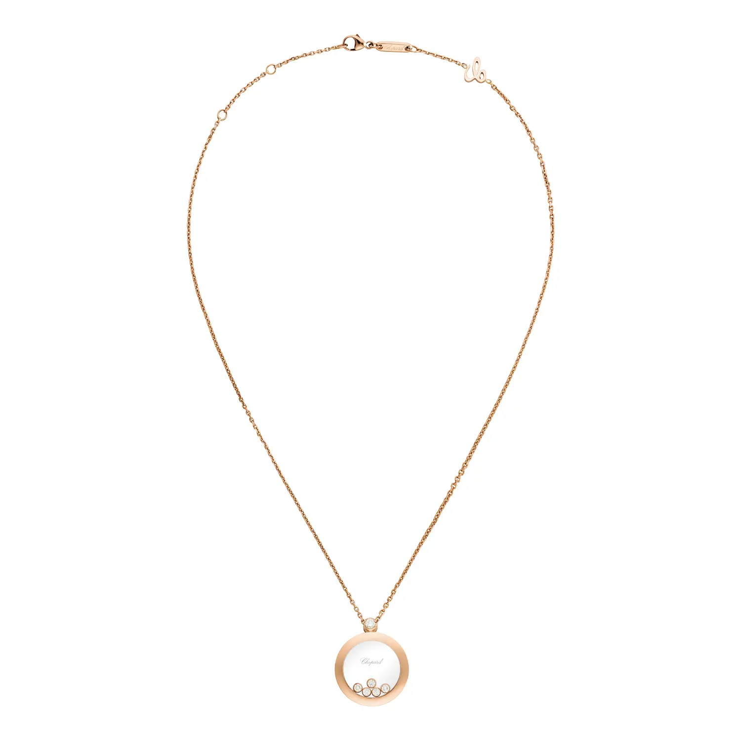 Die Chopard Happy Diamonds Icons 799434-5001 Halskette verkörpert feminine Eleganz und Lebensfreude. Gefertigt aus ethischem 18-karätigem Roségold, zeigt der runde Anhänger drei frei bewegliche Diamanten mit insgesamt 0,35 Karat, die zwischen Saphirgläsern tanzen – ein Symbol für Freiheit und Glück in der ikonischen Happy-Diamonds-Kollektion.