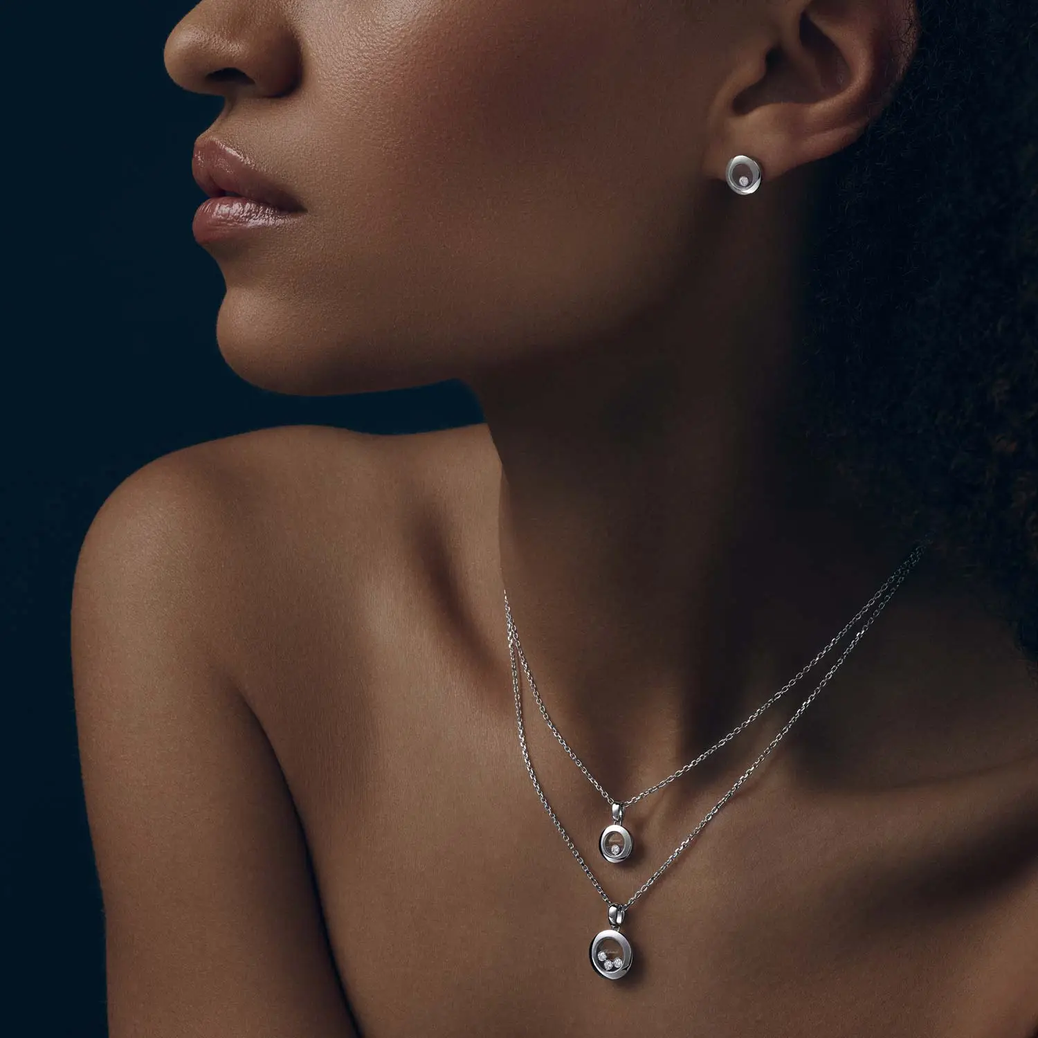 An einer 42 cm langen Kette getragen, zeigt er einen natürlichen runden Diamanten mit einem Gewicht von 0,05 ct, mit IF–VVS-Reinheit und F–G-Farbe. Der präzise geschliffene Stein funkelt bei jeder Bewegung und verleiht dem Schmuckstück anmutigen Glanz.
