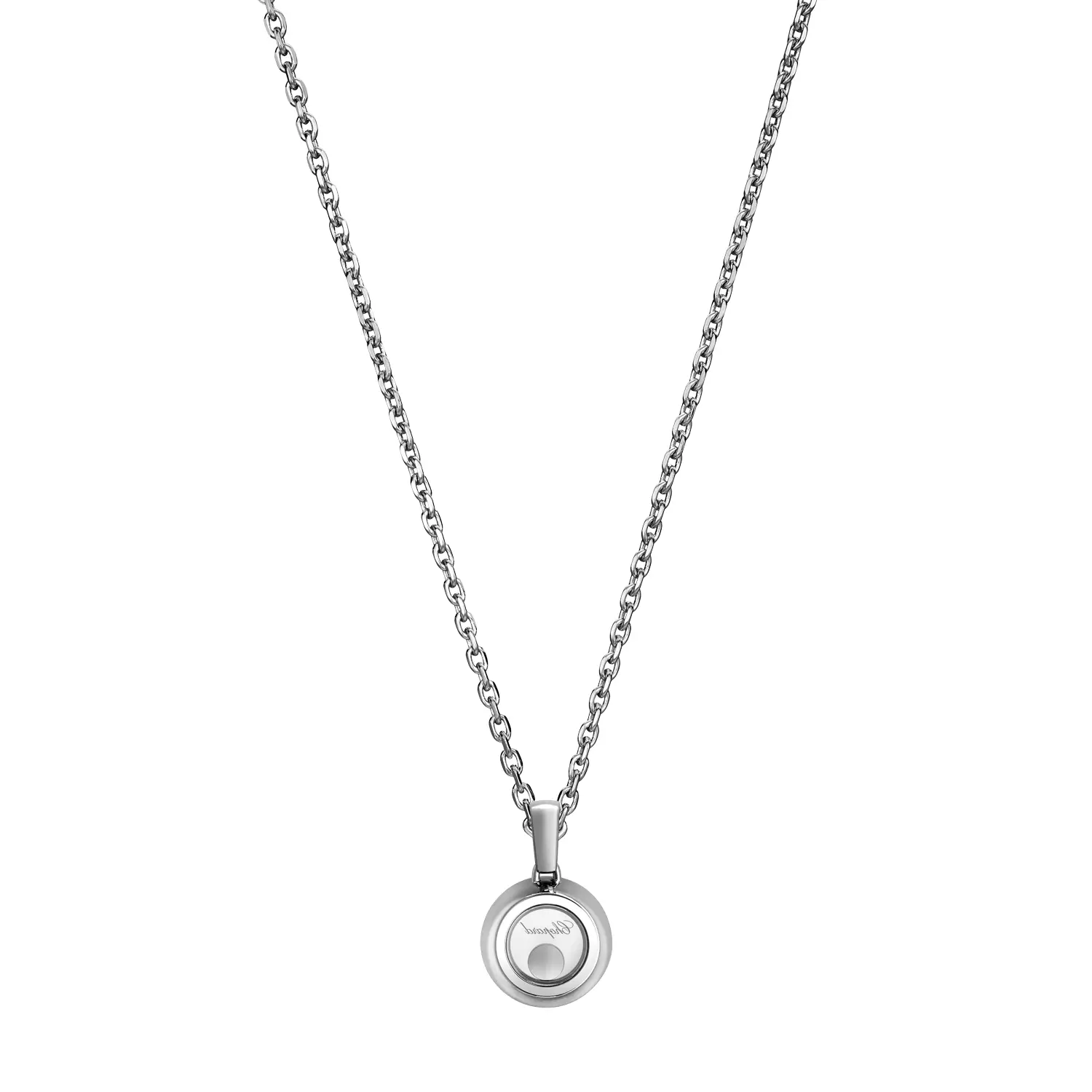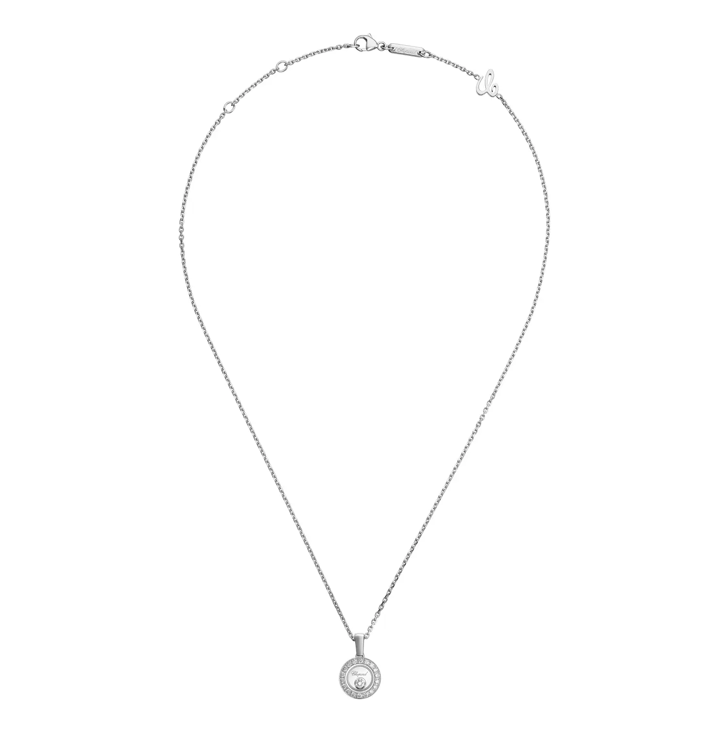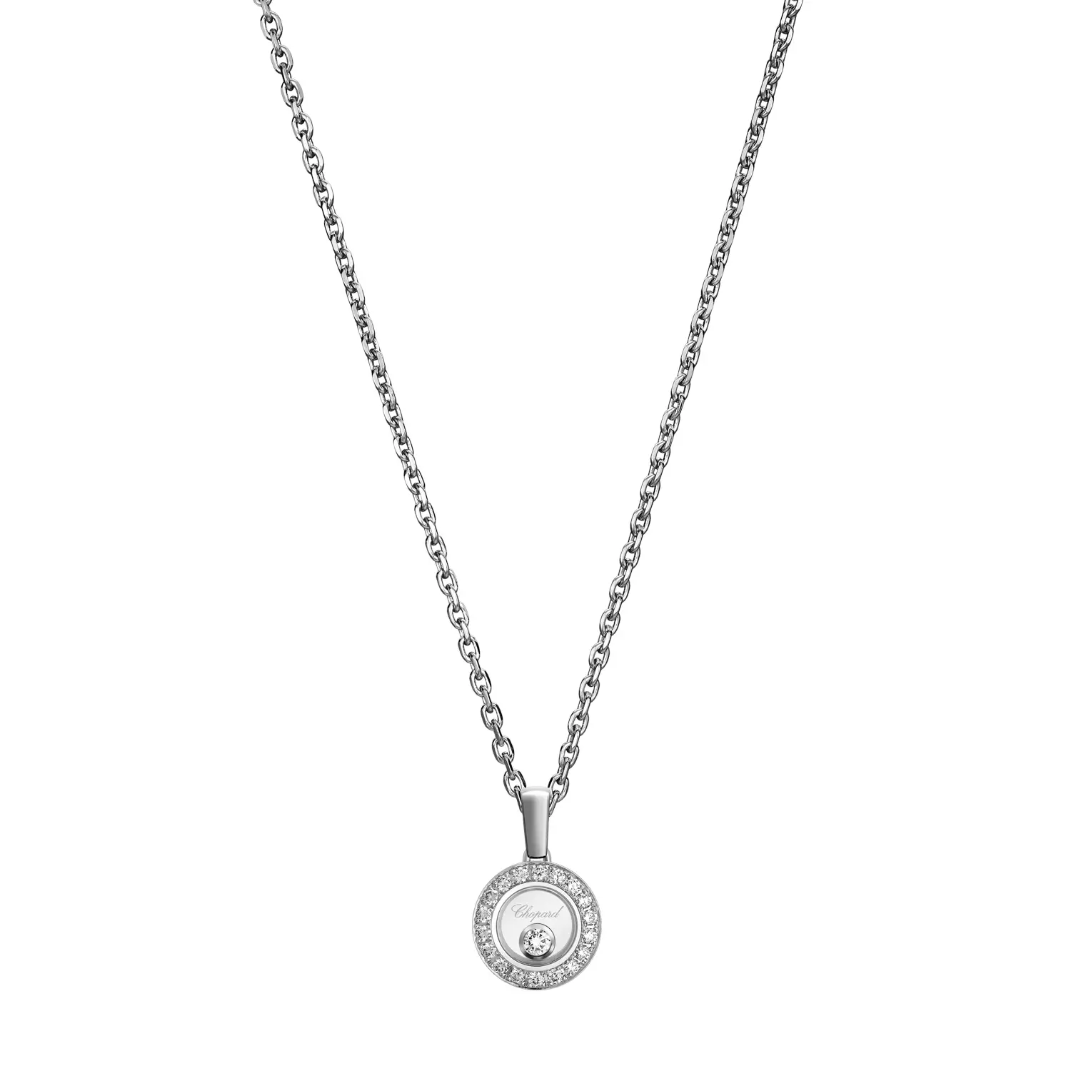 Gefertigt aus 18 Karat Weißgold, enthält der Anhänger drei bewegliche Diamanten, die zwischen zwei Saphirgläsern tanzen. Diese schwebenden Steine funkeln bei jeder Bewegung und symbolisieren Lebensfreude – ein Markenzeichen von Chopard. Die polierte Oberfläche unterstreicht die hohe Handwerkskunst des Hauses.