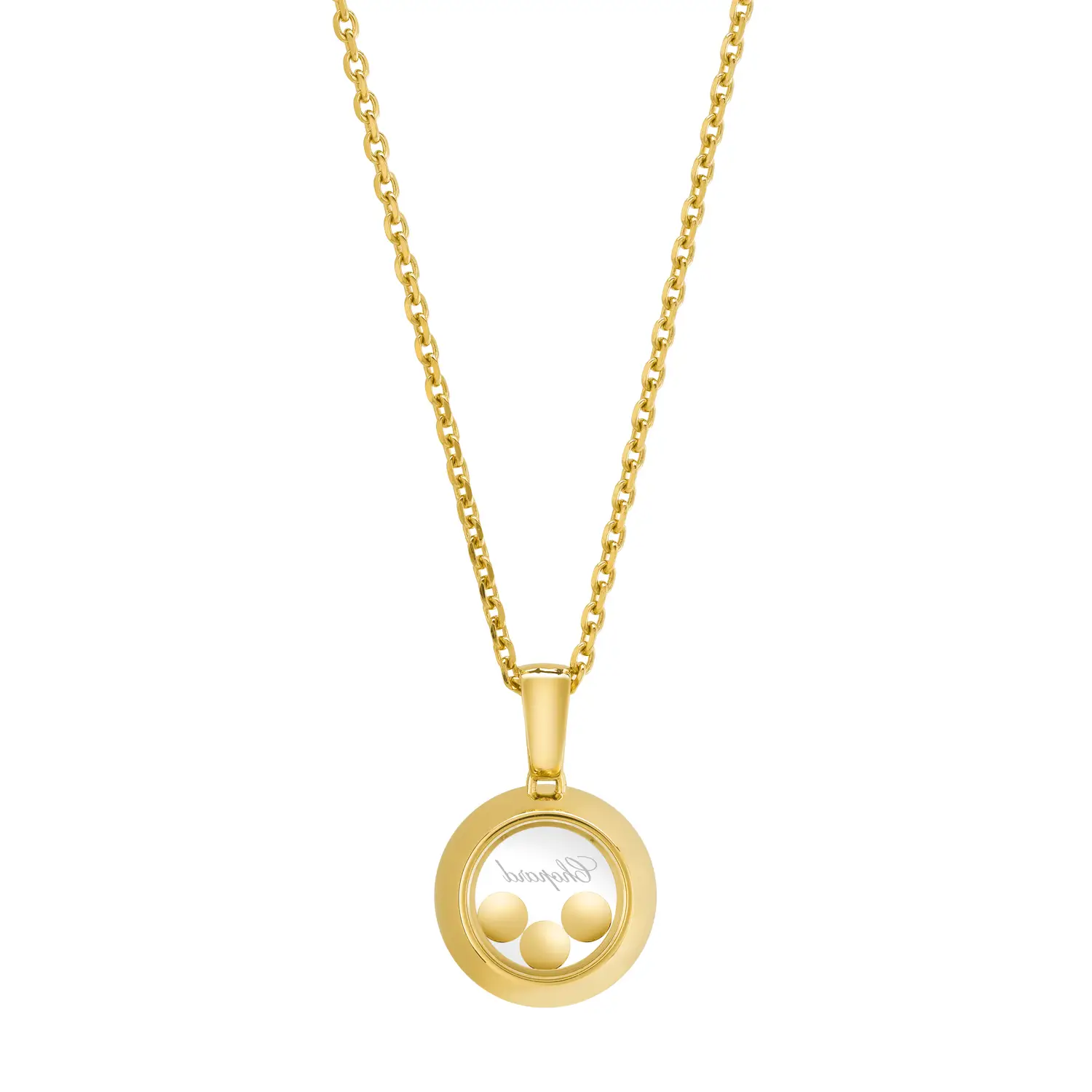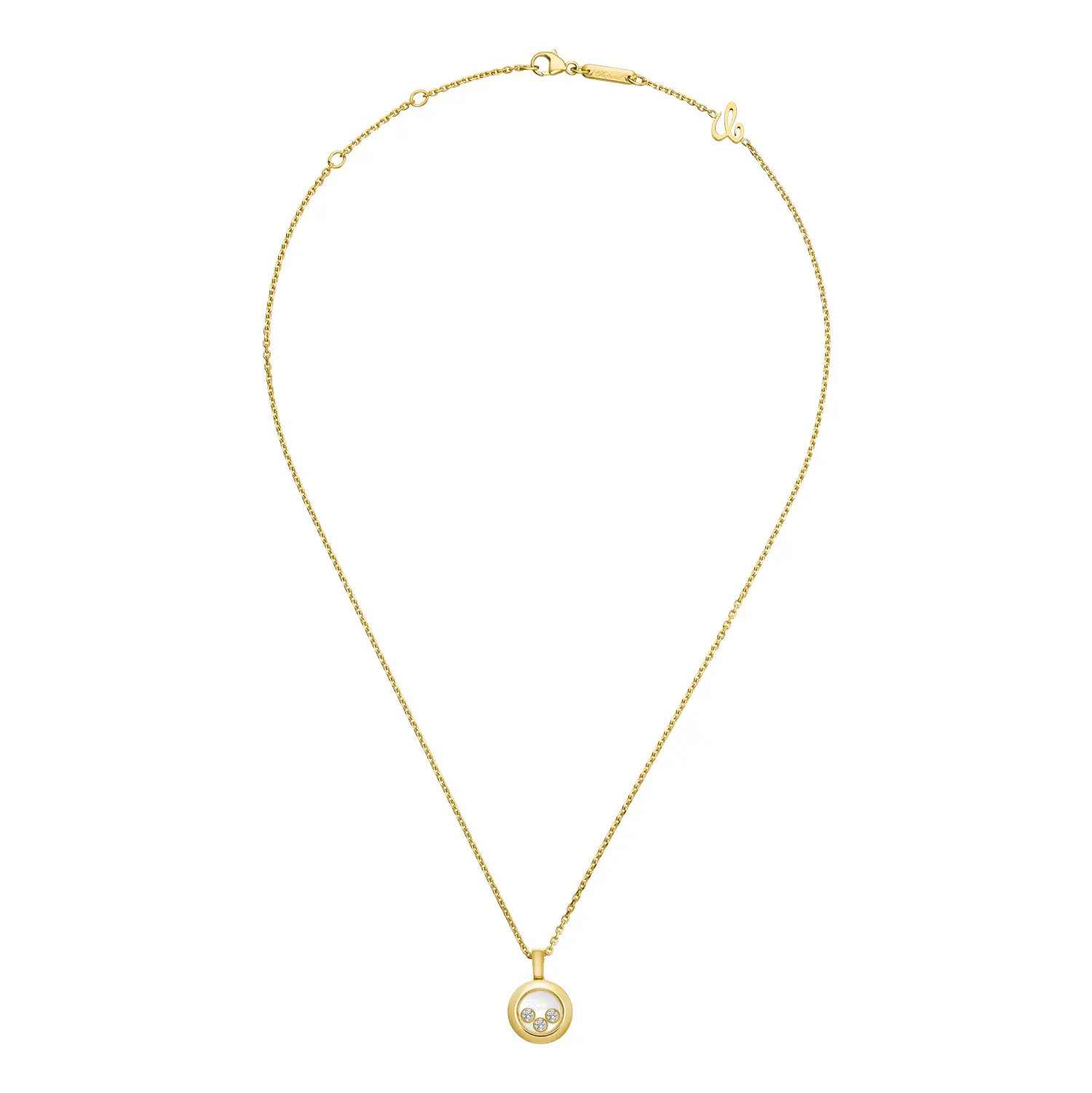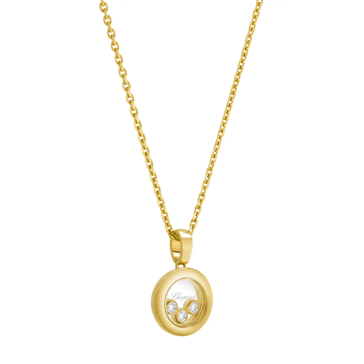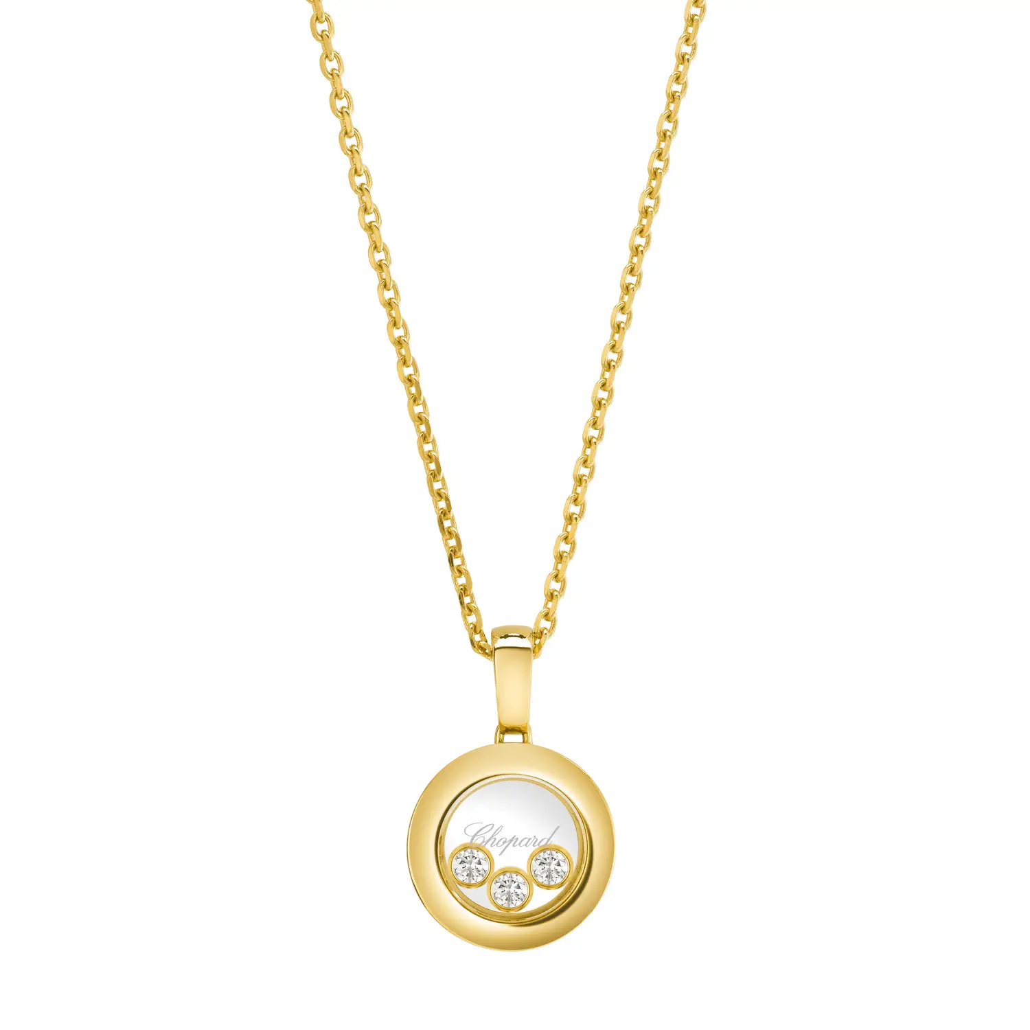 Der Chopard Happy Diamonds Icons 79A018-0001 Anhänger verkörpert Harmonie, Licht und Bewegung. Gefertigt aus ethischem 18-karätigem Gelbgold, zeigt er drei frei bewegliche Diamanten, die zwischen zwei Saphirgläsern tanzen – ein ikonisches Detail, das das Licht einfängt und funkelnde Lebendigkeit verleiht. Die runde Form unterstreicht seine feminine Eleganz.