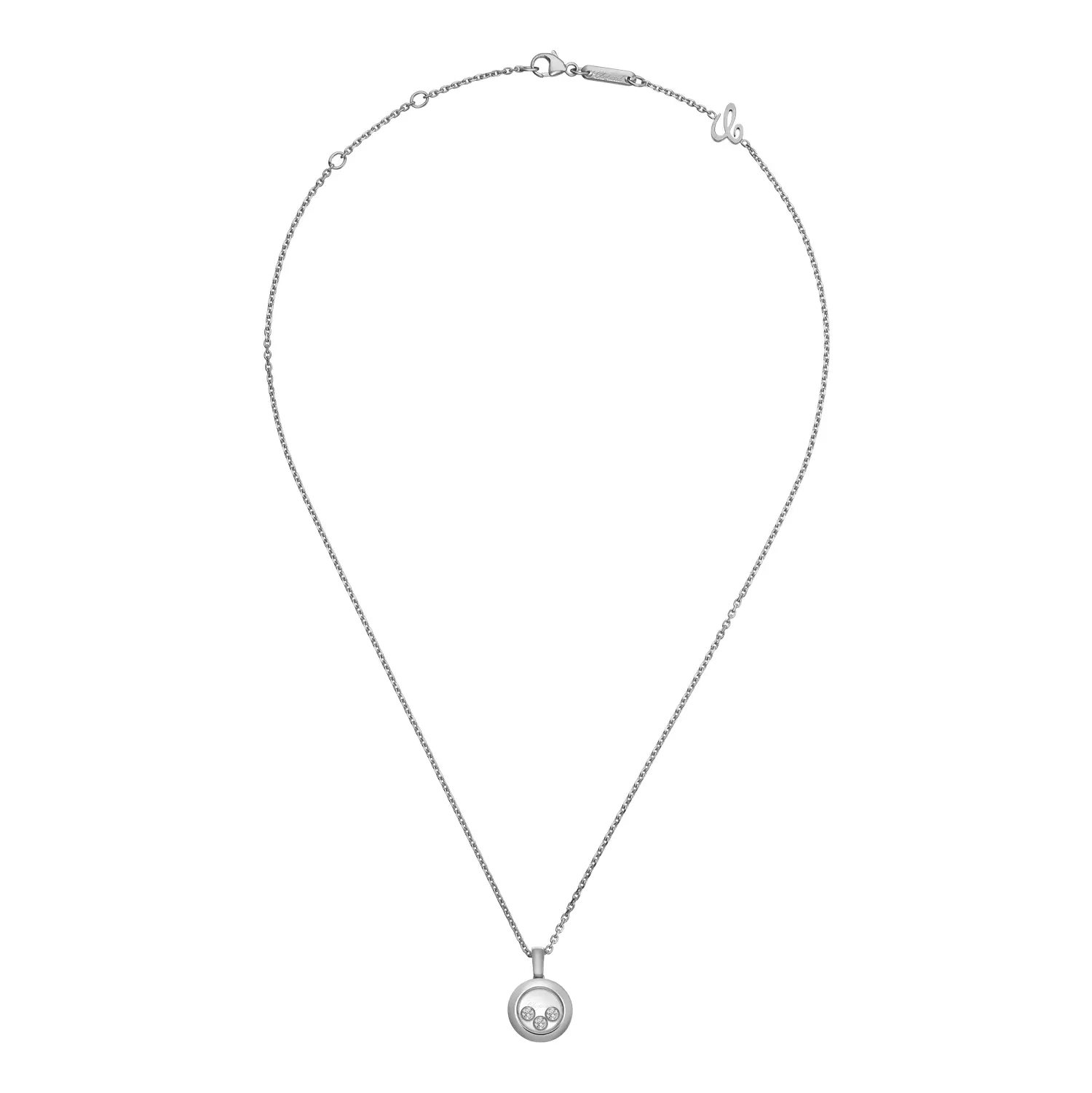 Im Mittelpunkt stehen drei natürliche runde Diamanten mit einem Gesamtgewicht von 0,15 ct, von IF–VVS-Reinheit und F–G-Farbe, die außergewöhnliche Brillanz und Reinheit garantieren und bei jeder Bewegung des Lichts funkeln. Die dezenten, aber strahlenden Diamanten in Kombination mit poliertem Weißgold schaffen den ikonischen Look, der für die Happy Diamonds Linie typisch ist.