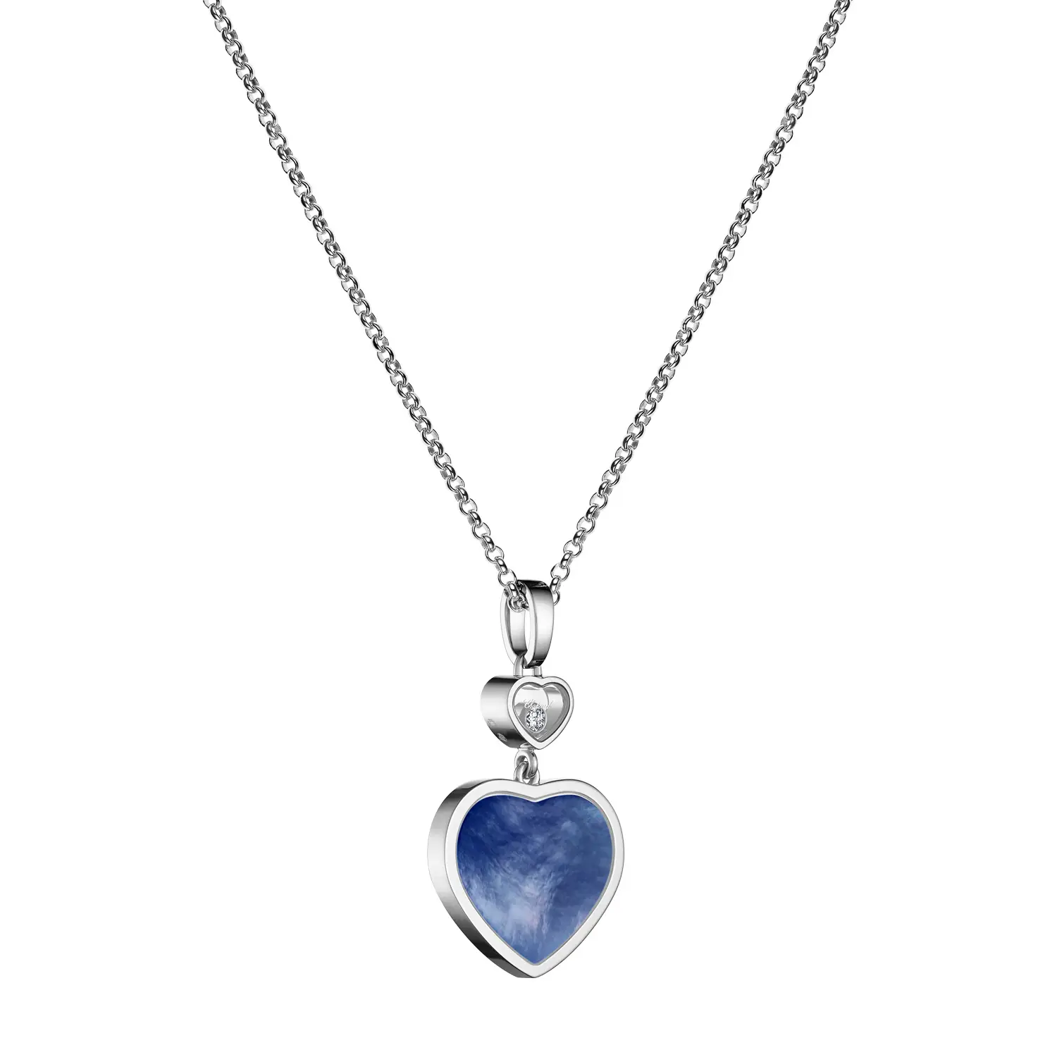 Im Mittelpunkt des Designs steht das typische Herz-Duo der Happy Hearts Kollektion – das größere Herz ist mit natürlichem blauen Perlmutt in Herzform besetzt, was dem Schmuckstück Tiefe, sanften Glanz und eine Symbolik für Ruhe und Ausgeglichenheit verleiht. Das kleinere Herz bildet einen eleganten Kontrast und rundet den luxuriösen Gesamteindruck perfekt ab.