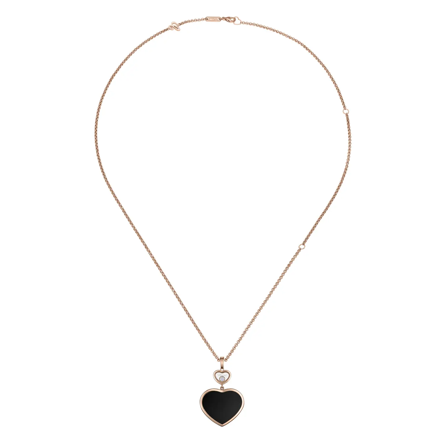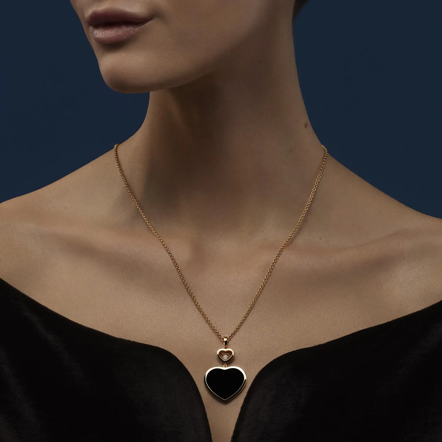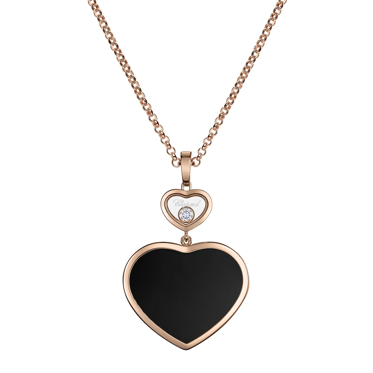 Die eine Hälfte ziert ein markanter herzförmiger Onyx aus natürlichem Ursprung, dessen tiefes Schwarz einen edlen Kontrast zum warmen Roségoldton bildet. Die andere Hälfte enthält einen frei beweglichen Diamanten in einem kleineren Herz. Dieser runde natürliche Diamant beeindruckt durch seine IF-Reinheit und Farbgrad F-G, was außergewöhnlichen Glanz garantiert.