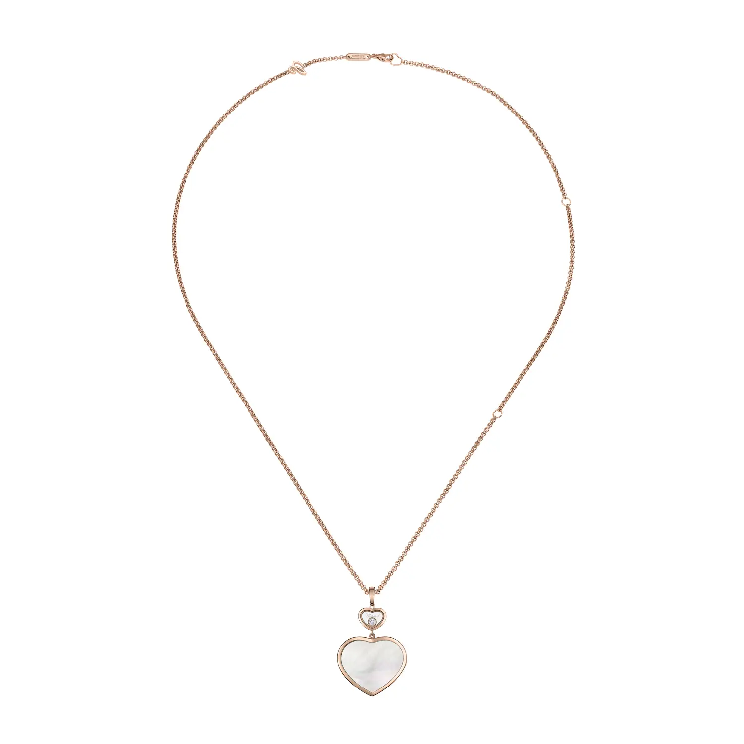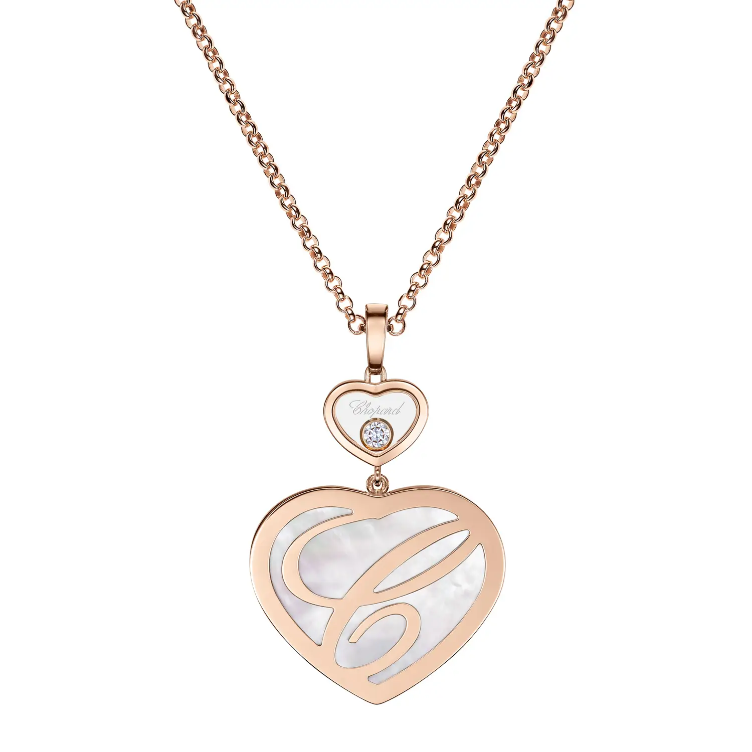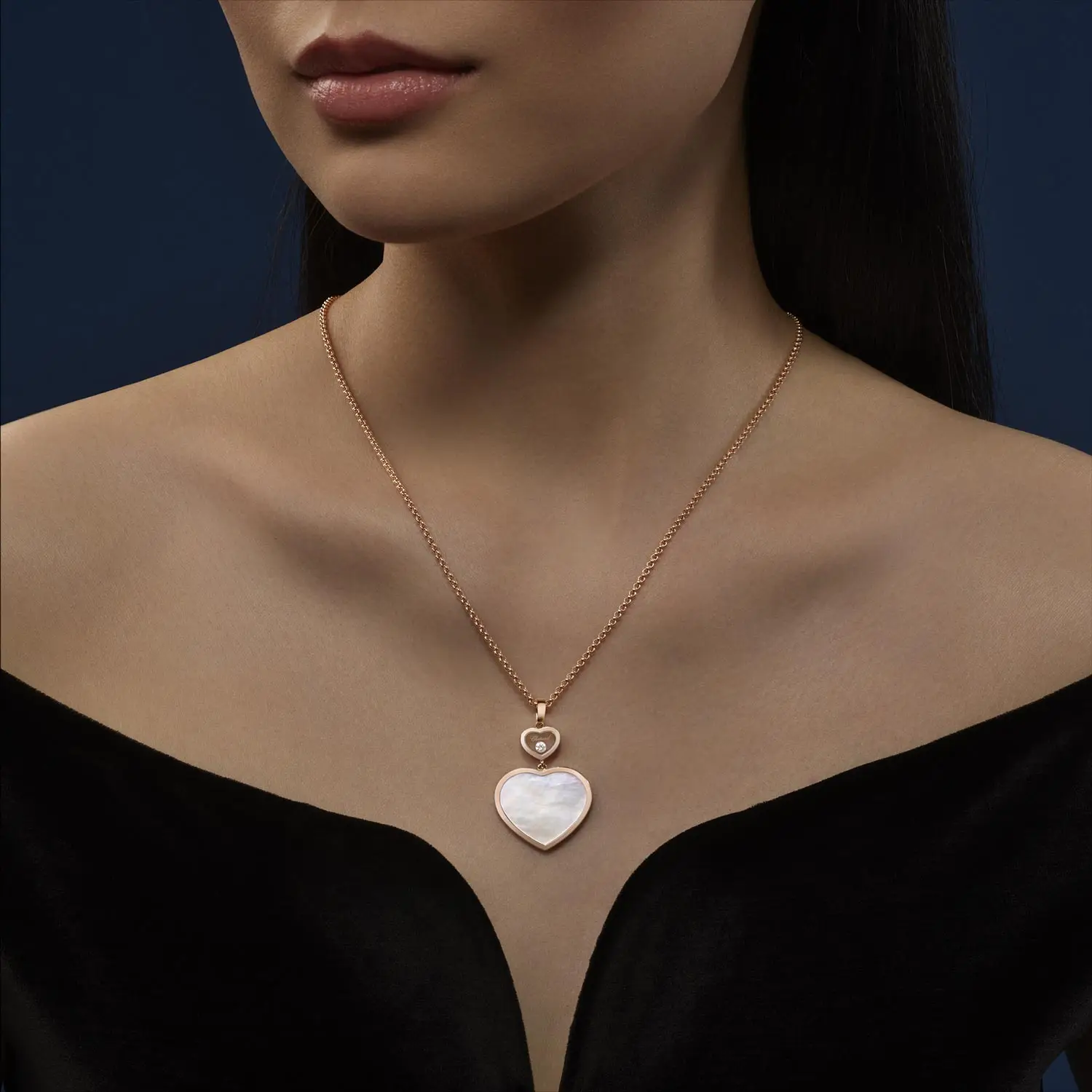 Im Mittelpunkt des Designs steht ein größeres Herz, verziert mit natürlichem weißem Perlmutt in Herzform, das Reinheit und Zärtlichkeit symbolisiert. Darüber befindet sich ein kleineres Herz mit einem frei beweglichen runden Diamanten von außergewöhnlicher IF–VVS-Reinheit und F–G-Farbe, der bei jeder Bewegung das Licht einfängt und ein faszinierendes Funkeln erzeugt.