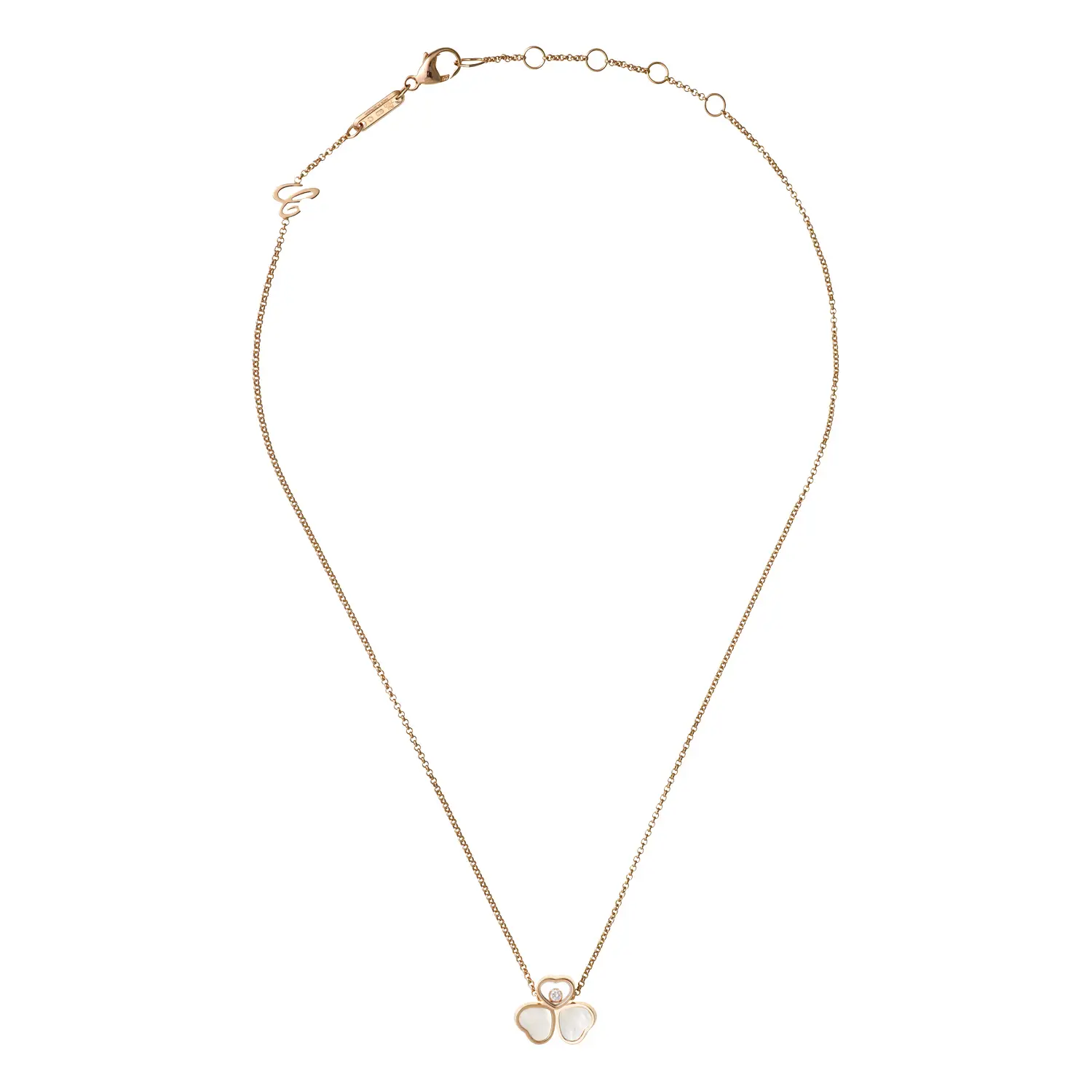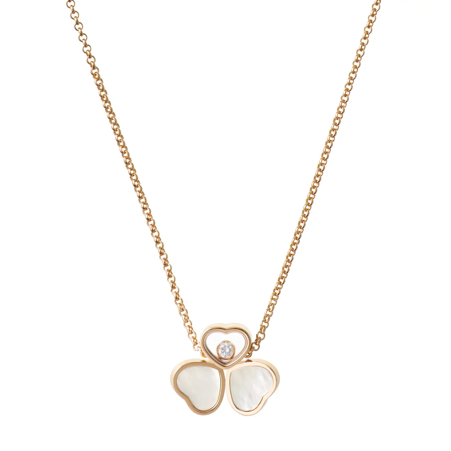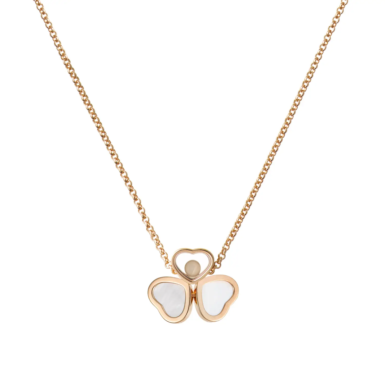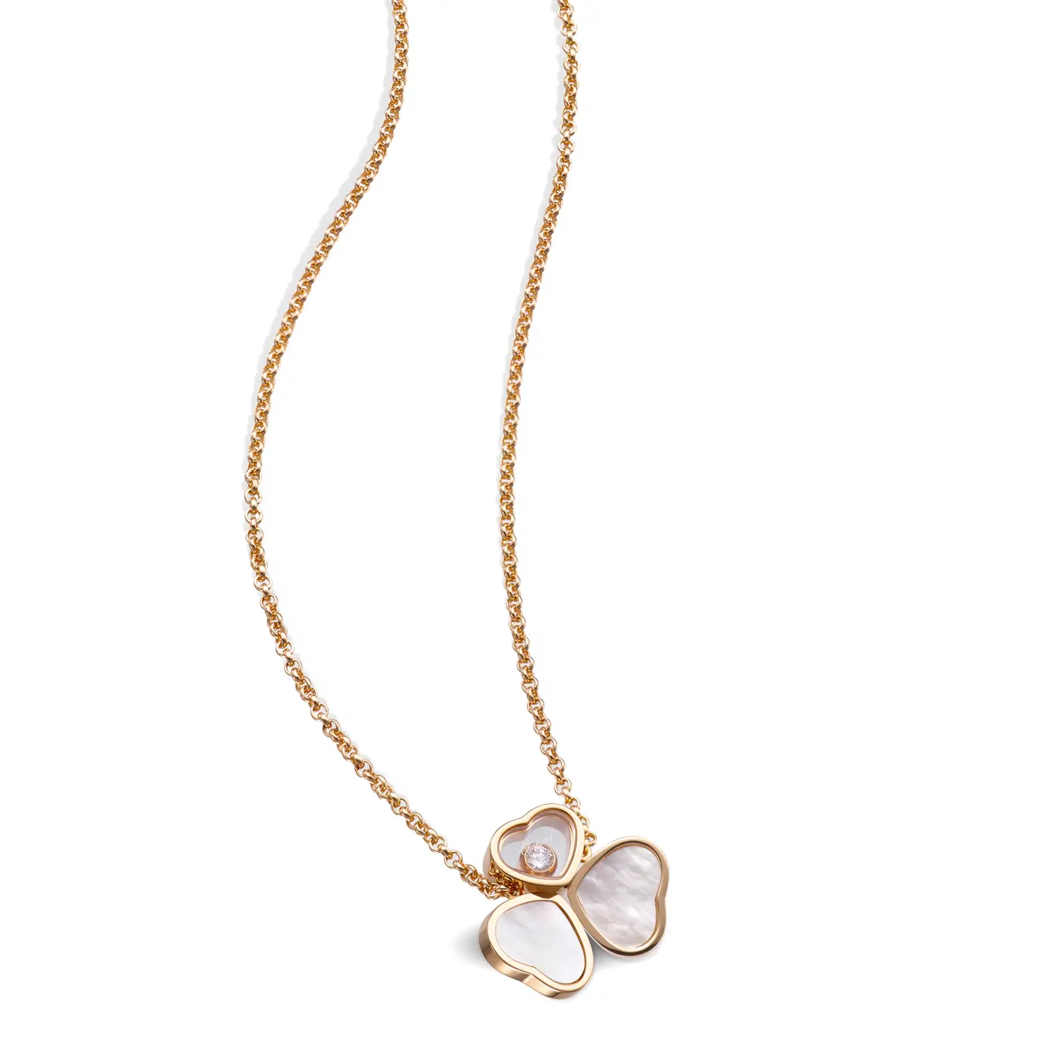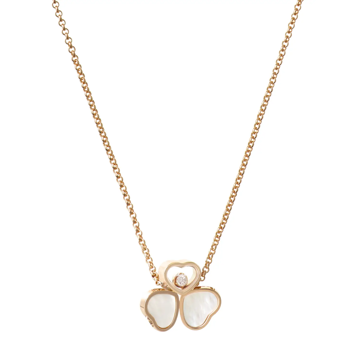 Diese bezaubernde Halskette aus der Happy Hearts Wings-Kollektion symbolisiert Leichtigkeit, Freude und feminine Eleganz. Gefertigt aus 18 kt Roségold und verziert mit zwei Perlmutt-Herzen, die wie zarte Flügel wirken, sowie einem zentralen Herz mit einem frei beweglichen Diamanten von ca. 0,05 ct, entfaltet sie eine anmutige und luftige Ausstrahlung.