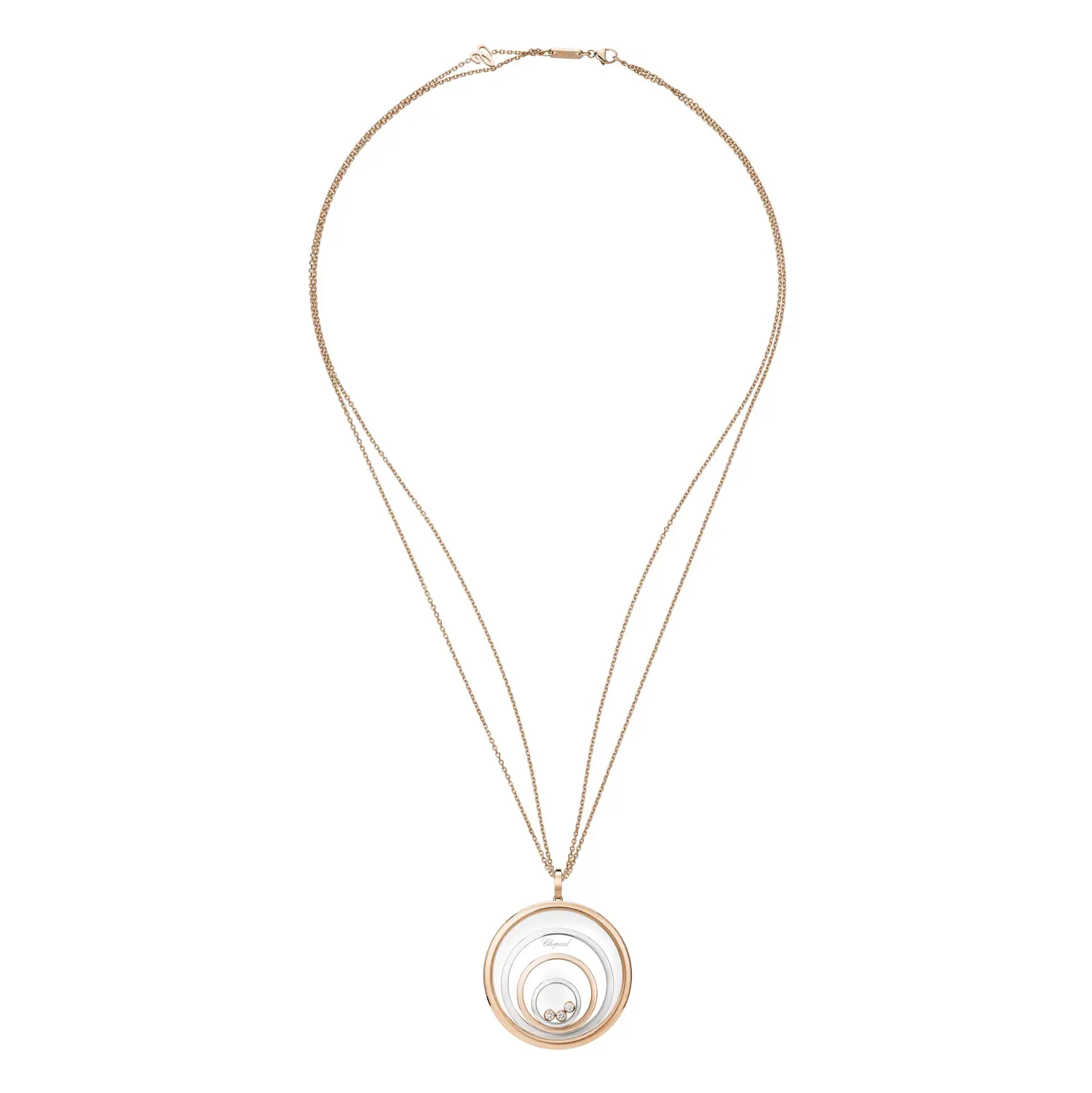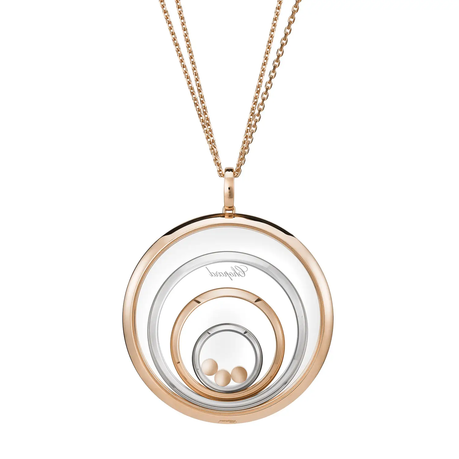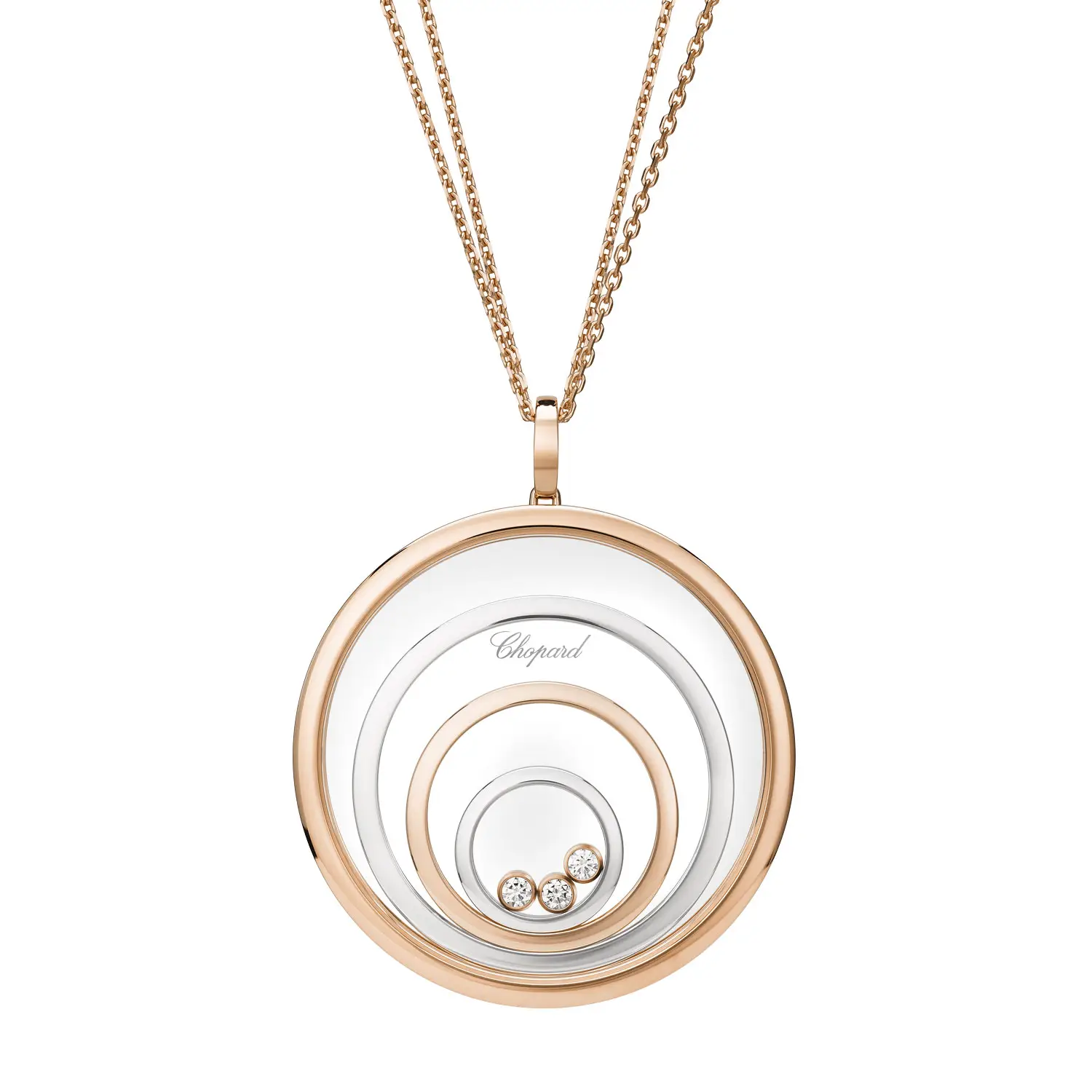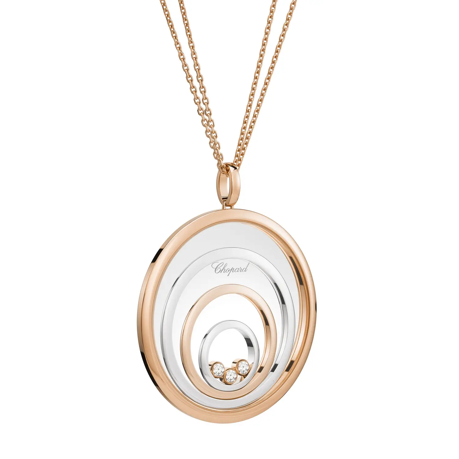 Der Chopard Happy Spirit 798233-9001 Anhänger verkörpert Harmonie, Weiblichkeit und zeitlose Eleganz. Gefertigt aus einer Kombination von ethischem 18-karätigem Rosé- und Weißgold, besticht das Design durch konzentrische Kreise, die Gleichgewicht und Ruhe symbolisieren. Im Zentrum tanzt ein freibeweglicher Diamant zwischen zwei Saphirgläsern, umgeben von weiteren Steinen mit einem Gesamtgewicht von 0,28 Karat – der ikonische „Happy Diamonds“-Effekt verleiht dem Schmuckstück Leichtigkeit und Glanz.