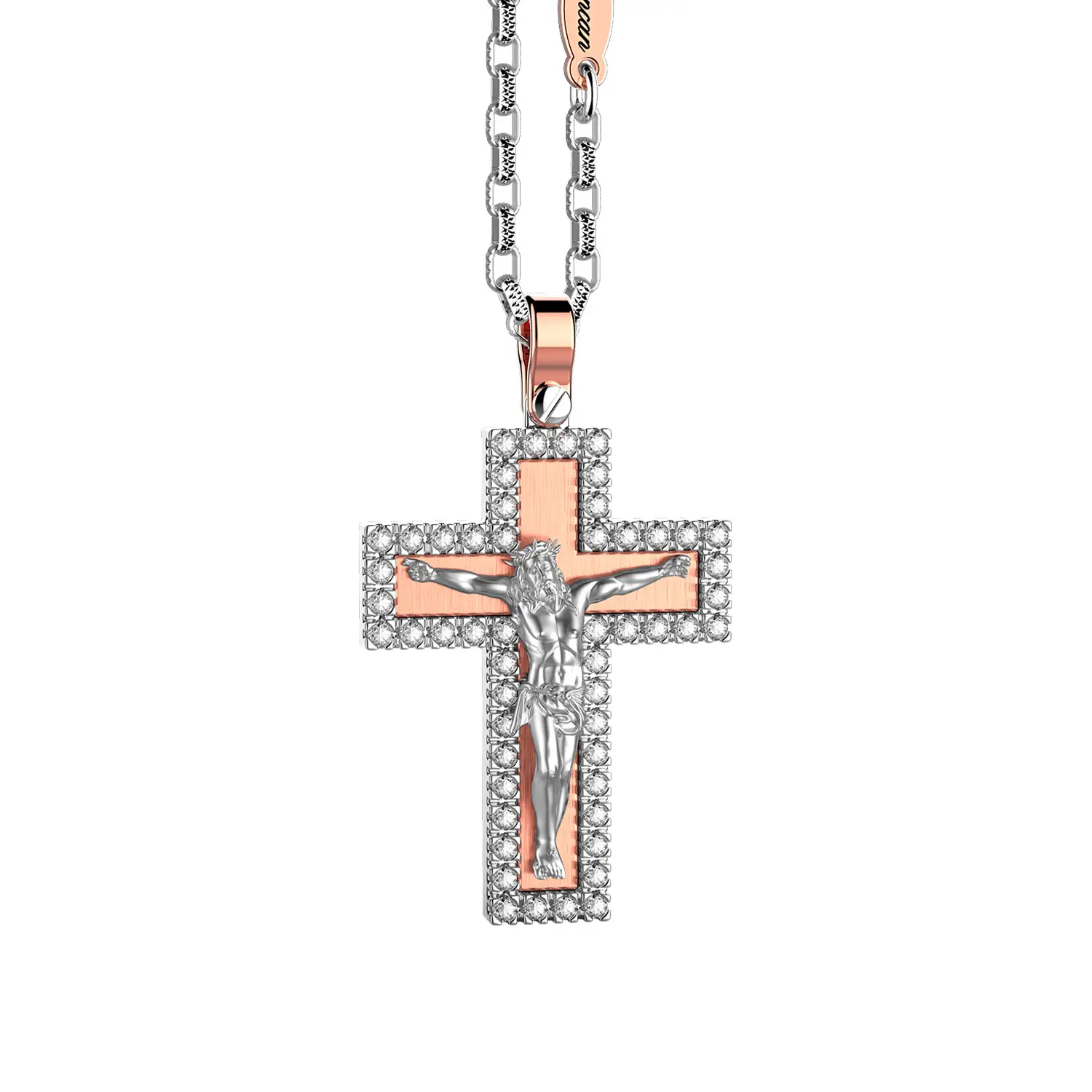 Der Zancan Couture EC901RB ist ein markanter Anhänger, der modernes Design mit einem persönlichen Glaubenssymbol verbindet. Gefertigt aus 18 K Gold (750/1000) in Bicolor (Weiß- & Roségold) mit edlem poliert / matt-Kontrast, trägt er ein Kreuzmotiv (religiös) und wird an einer 60 cm Kette getragen – ideal für den Alltag wie auch für besondere Momente.