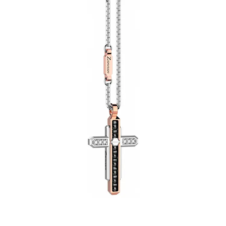 Der Zancan EC805BR60 ist ein markanter Anhänger, der modernes italienisches Design mit einem persönlichen Glaubenssymbol verbindet. Er besticht durch 18 K Gold (750/1000) in Bicolor Weiß- & Roségold mit polierter Oberfläche und dem charakteristischen Kreuzmotiv (religiös). Ausgewogene Proportionen und die Länge von 60 cm sorgen für hohen Tragekomfort und passen zu legeren wie formellen Looks.