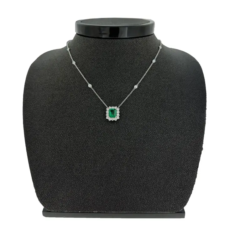 Gefertigt aus 18 kt (750/1000) Weißgold mit polierter Oberfläche, strahlt der Anhänger Luxus und Reinheit aus. Im Mittelpunkt steht ein natürlicher Smaragd von 1,46 ct im Emerald-Schliff, umgeben von Diamanten mit 0,64 + 0,16 ct der Qualität G/VS. Mit einem Gesamtgewicht von 4,3 g besticht er durch seine harmonischen Proportionen und außergewöhnliche Leuchtkraft.