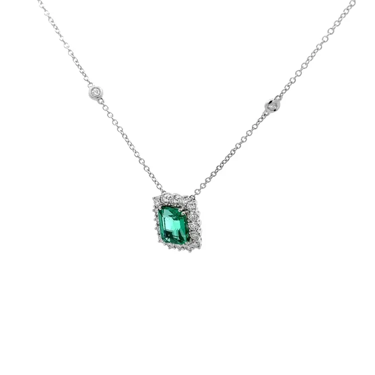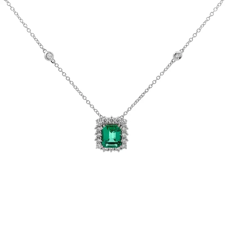 Gefertigt aus 18 kt (750/1000) Weißgold und mit einem Gewicht von 5,5 g, vereint dieser Anhänger Eleganz und Präsenz. Im Mittelpunkt steht ein natürlicher Smaragd von 2,03 ct im Emerald-Schliff, ergänzt durch Diamanten von 0,65 + 0,17 ct in der Qualität G/VS. Jeder Stein wurde sorgfältig gefasst, um seine Reinheit und Leuchtkraft optimal zur Geltung zu bringen.