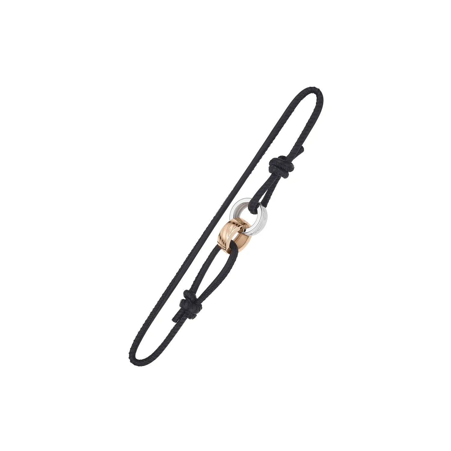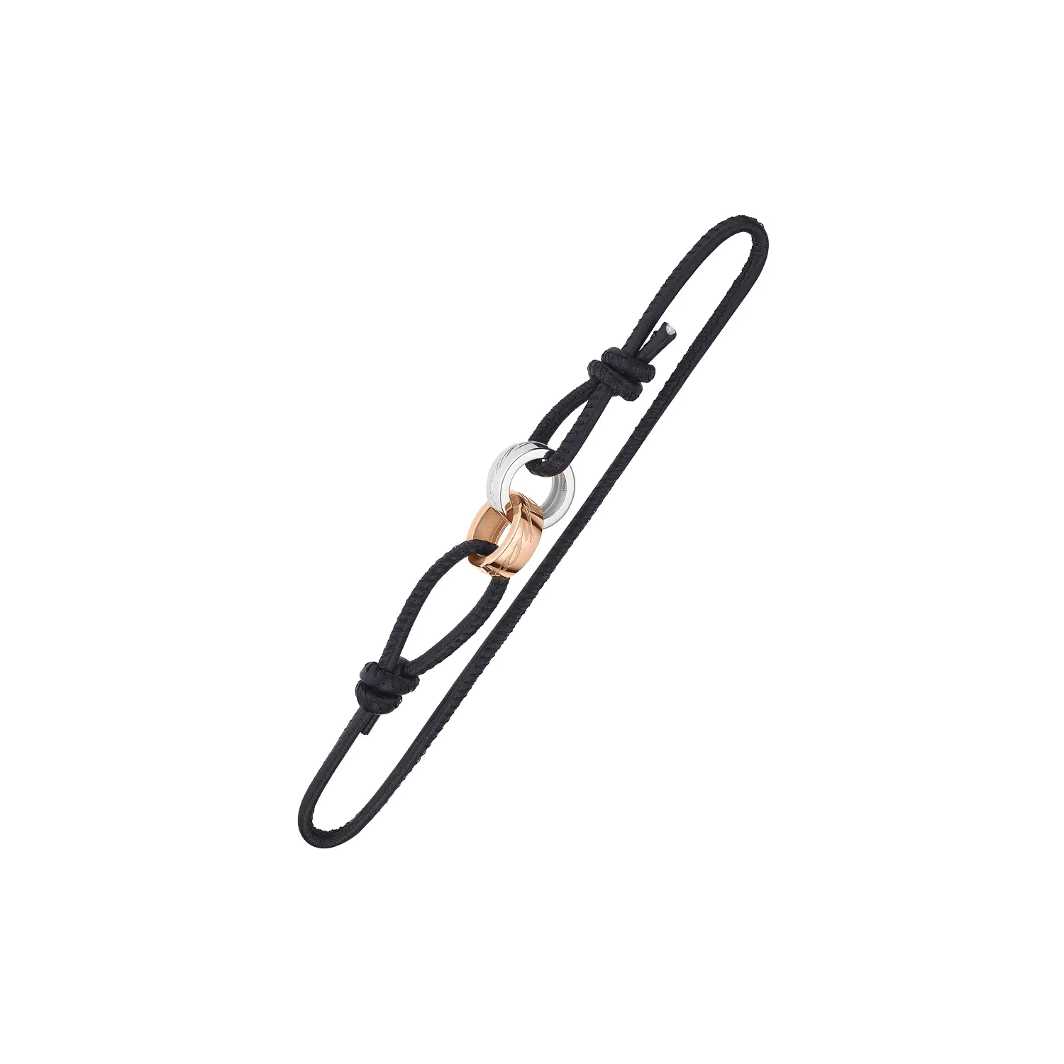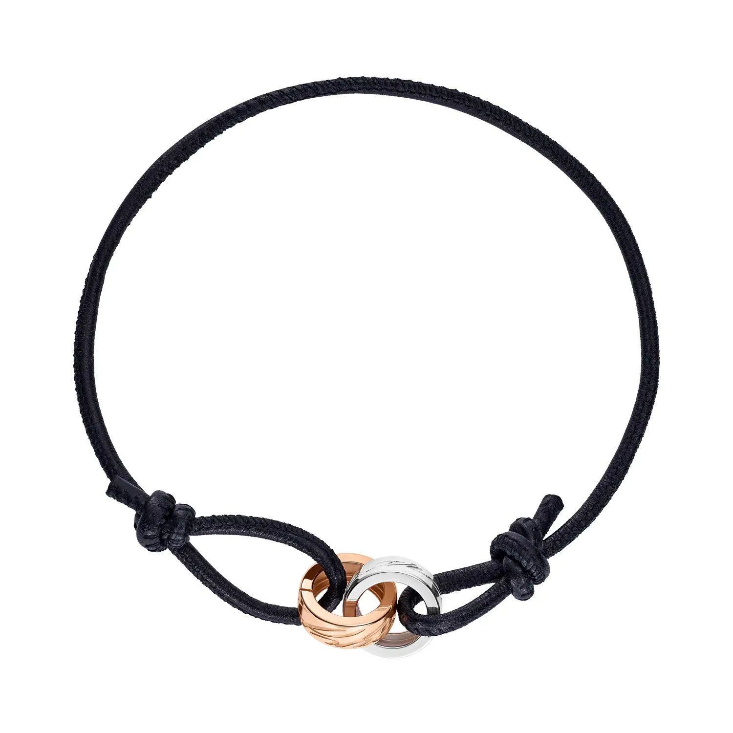 Dieses elegante Armband aus der Chopardissimo-Kollektion vereint markantes Design mit subtiler Eleganz. Gefertigt aus einer Kombination von 18 kt Rosé- und Weißgold und ergänzt durch ein schwarzes Lederband, entsteht ein harmonischer Kontrast zwischen glänzendem Metall und weichem Leder. Die gravierte Chopard-Signatur verleiht dem Schmuckstück einen unverwechselbaren, luxuriösen Charakter.
