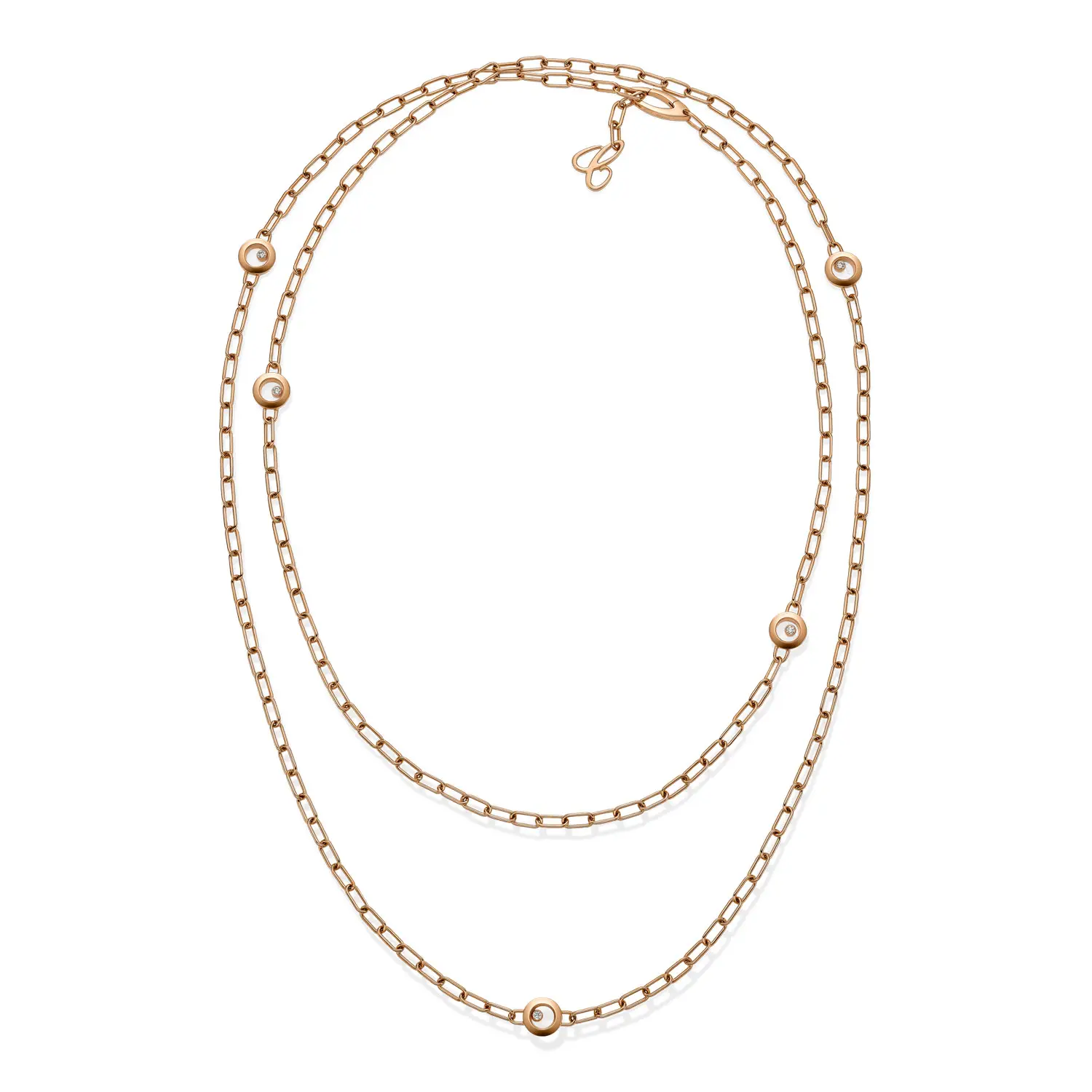 In jedem Anhänger tanzt ein Brillant zwischen zwei Saphirgläsern, das ikonische Merkmal der Happy Diamonds Kollektion, das bei jeder Bewegung das Licht einfängt. Durch ihre Länge lässt sich die Kette vielseitig tragen – lang und elegant oder doppelt geschlungen für einen modernen Look.