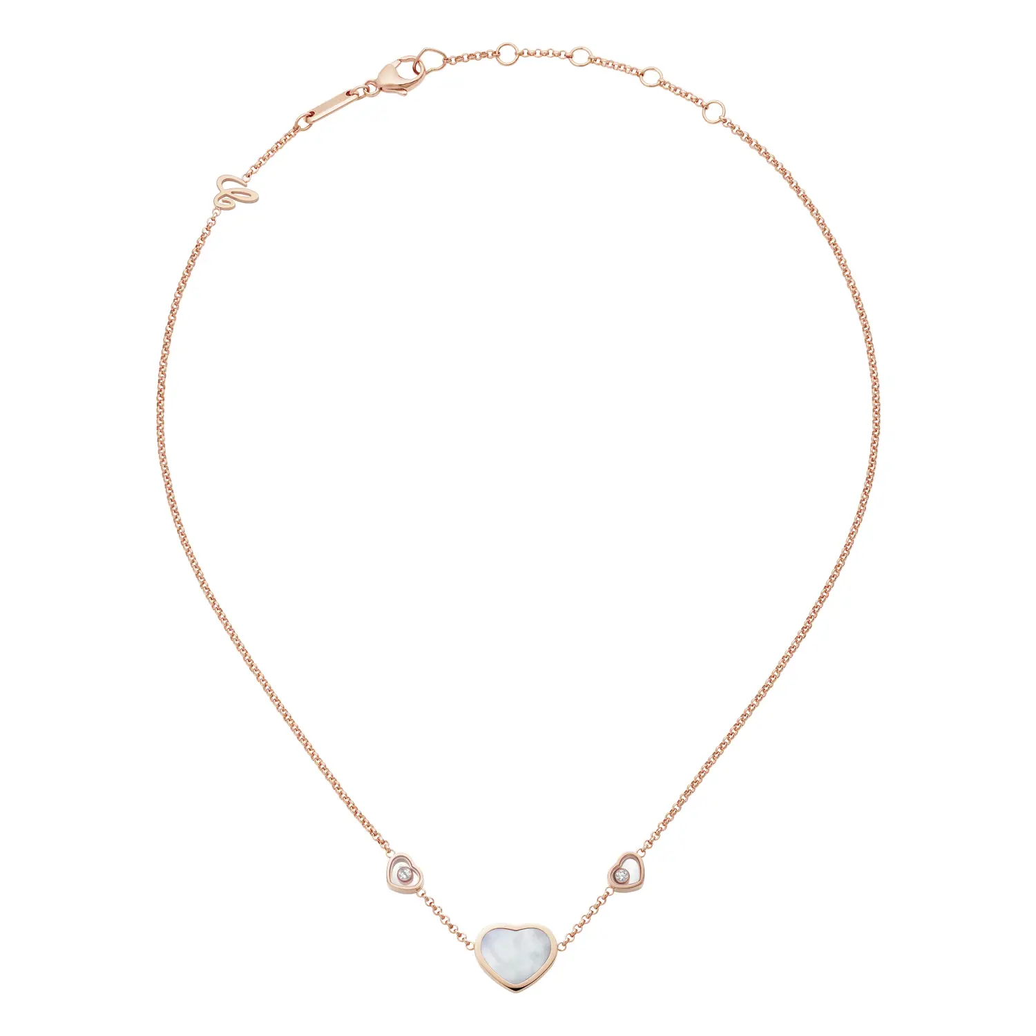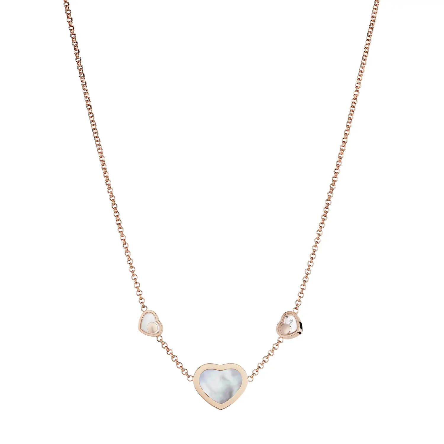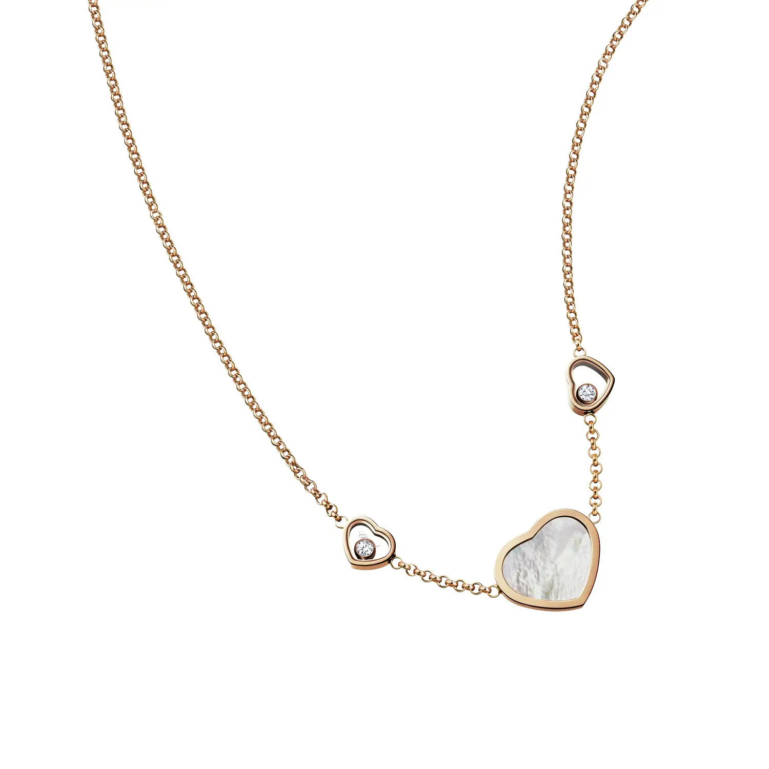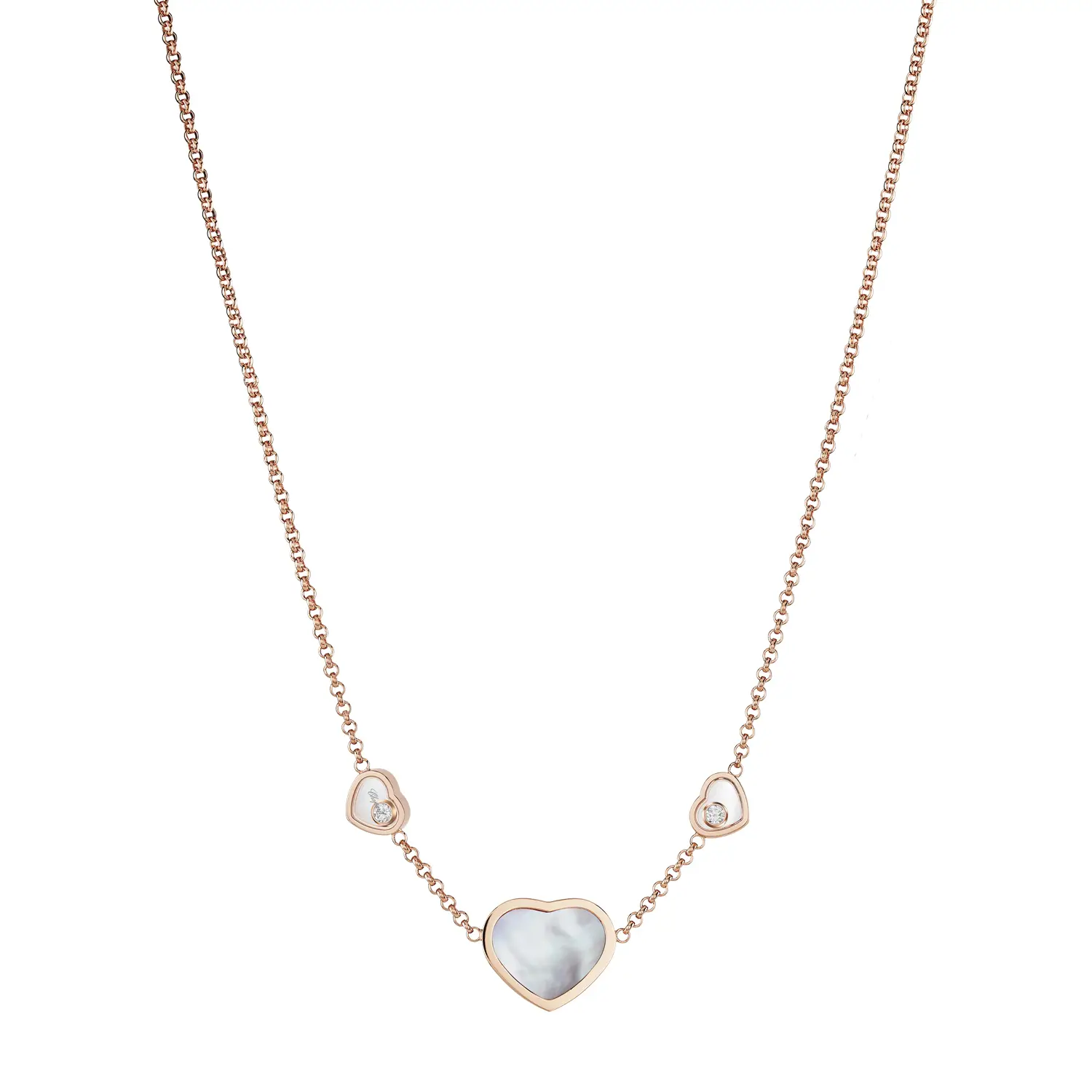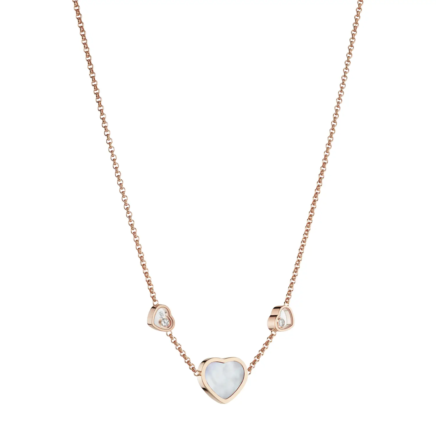 Diese elegante Halskette aus der Happy Hearts-Kollektion verkörpert Freude, Zärtlichkeit und feminine Anmut – Werte, die Chopard seit jeher auszeichnen. Gefertigt aus 18 kt Roségold und verziert mit einem Herzmotiv aus echter Perlmutt, ergänzt durch einen funkelnden Diamanten, drückt sie die Philosophie der Marke aus: „Little Diamonds Do Great Things.“ Das Zusammenspiel von sanftem Perlmuttglanz und warmem Goldton verleiht dem Schmuckstück verspielte Eleganz.