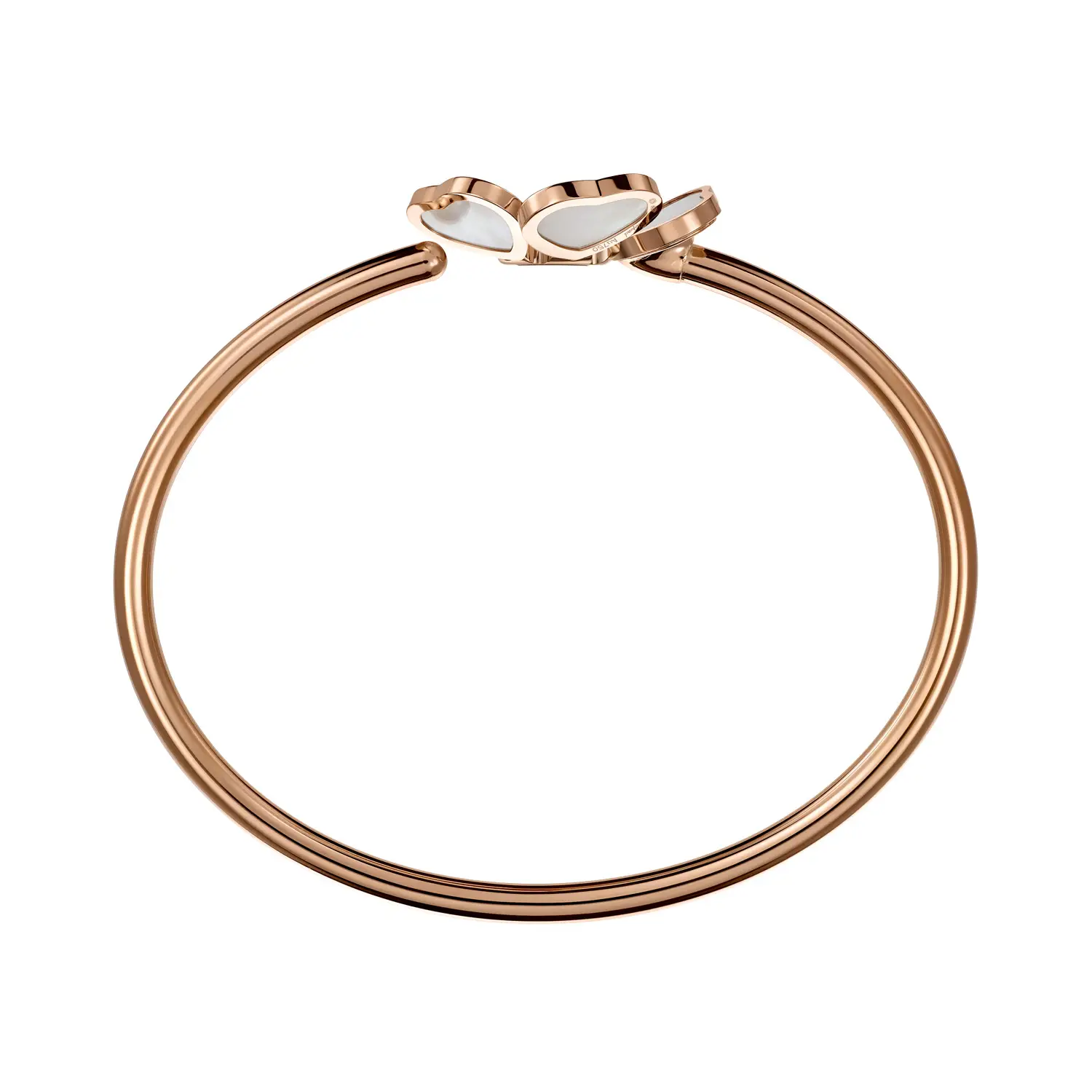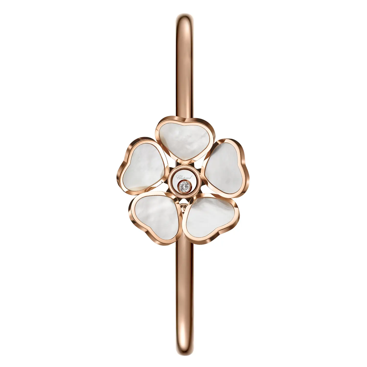 Dieser bezaubernde Armreif aus der Happy Hearts Flowers-Kollektion verkörpert feminine Eleganz und Lebensfreude. Gefertigt aus 18 kt Roségold, ist er mit einem Blumenmotiv mit fünf Blütenblättern aus weißem Perlmutt und einem frei beweglichen Diamanten von ca. 0,05 ct verziert, der bei jeder Bewegung sanft aufblitzt. Der warme Goldton harmoniert perfekt mit dem schimmernden Perlmutt und verleiht dem Schmuckstück eine romantische Ausstrahlung.