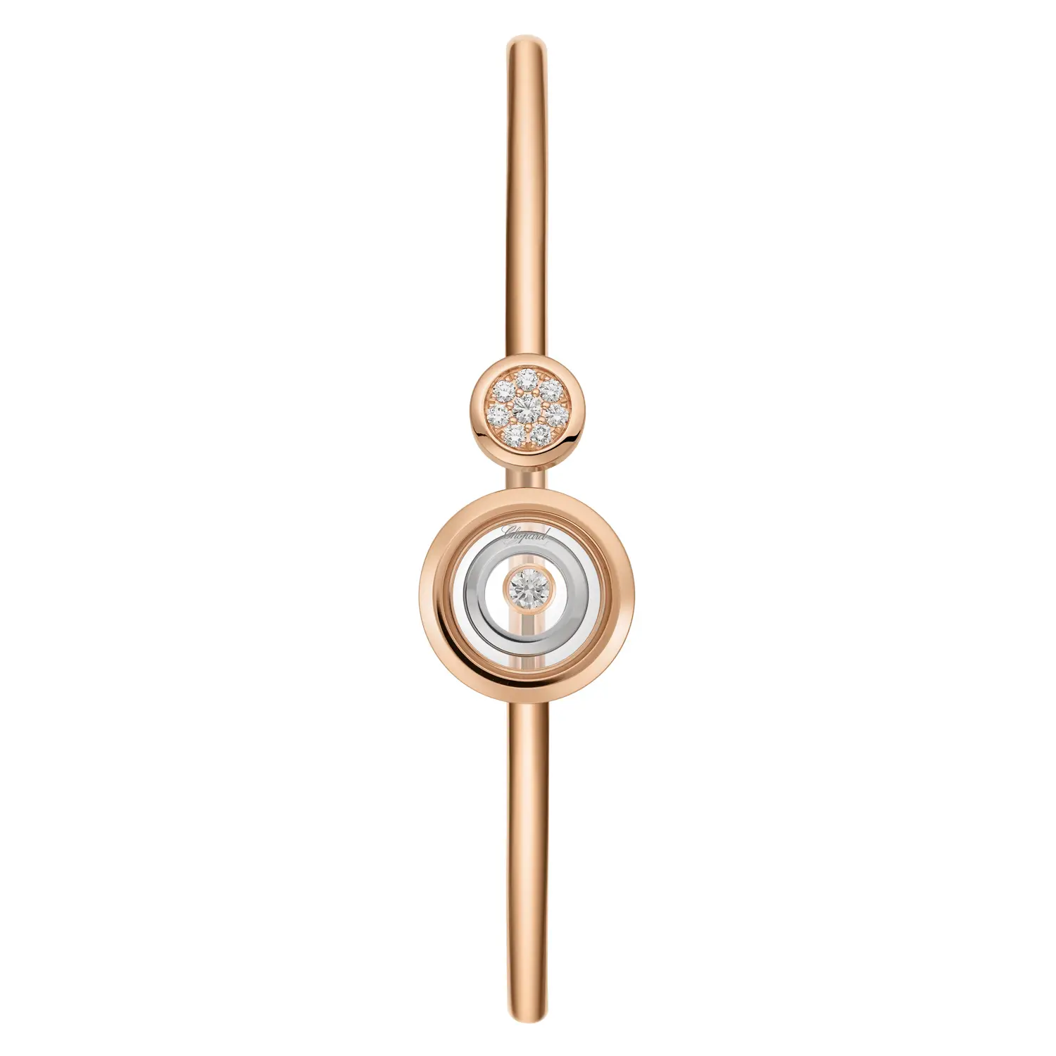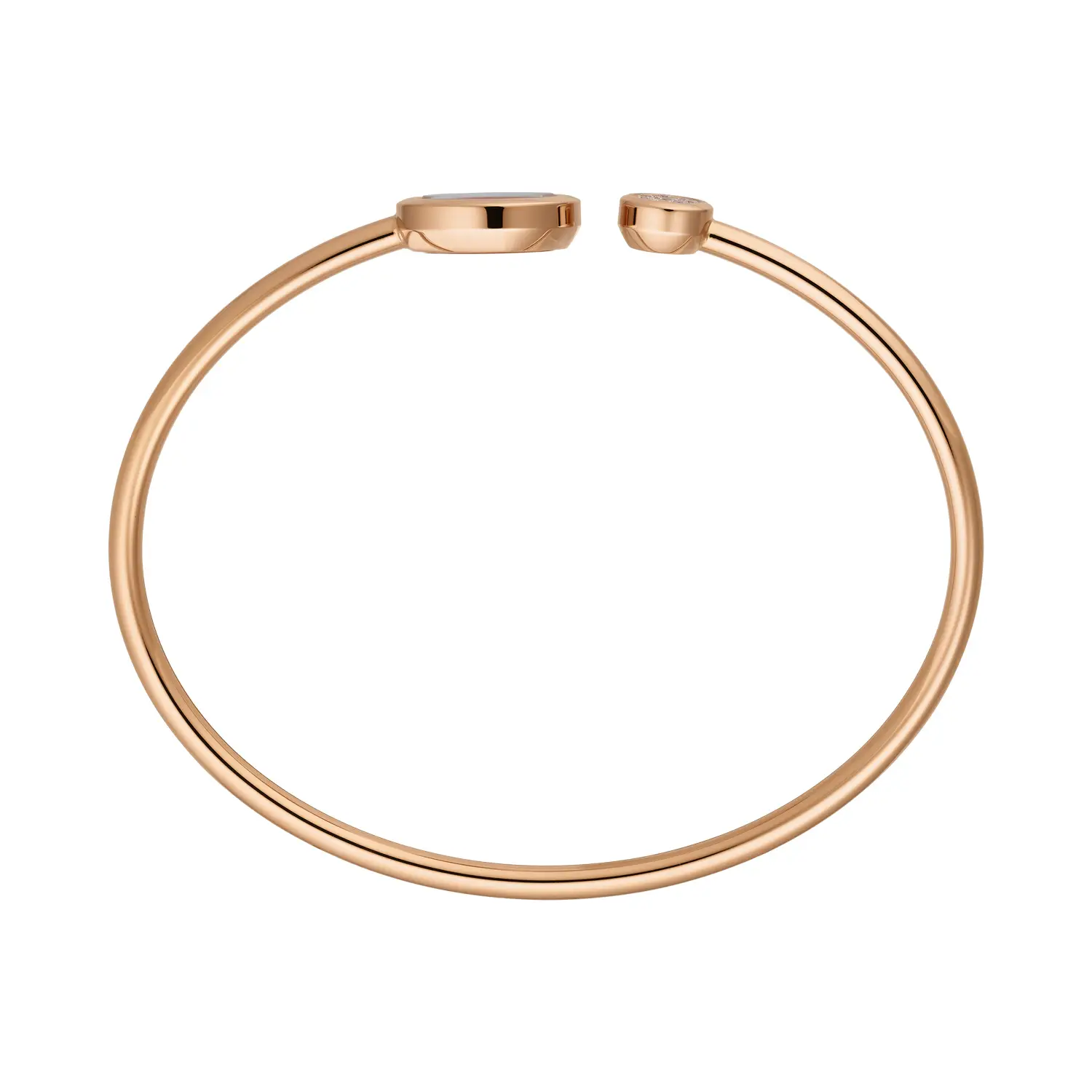 Dieser edle Armreif aus der Happy Spirit-Kollektion vereint Licht, Bewegung und feminine Eleganz. Gefertigt aus einer Kombination von 18 kt Weiß- und Roségold, ist er mit einem frei beweglichen Diamanten versehen, der zwischen zwei Saphirgläsern eingefasst ist. Die konzentrischen Kreise symbolisieren Einheit, Harmonie und innere Ruhe – Werte, die das Design von Chopard prägen.