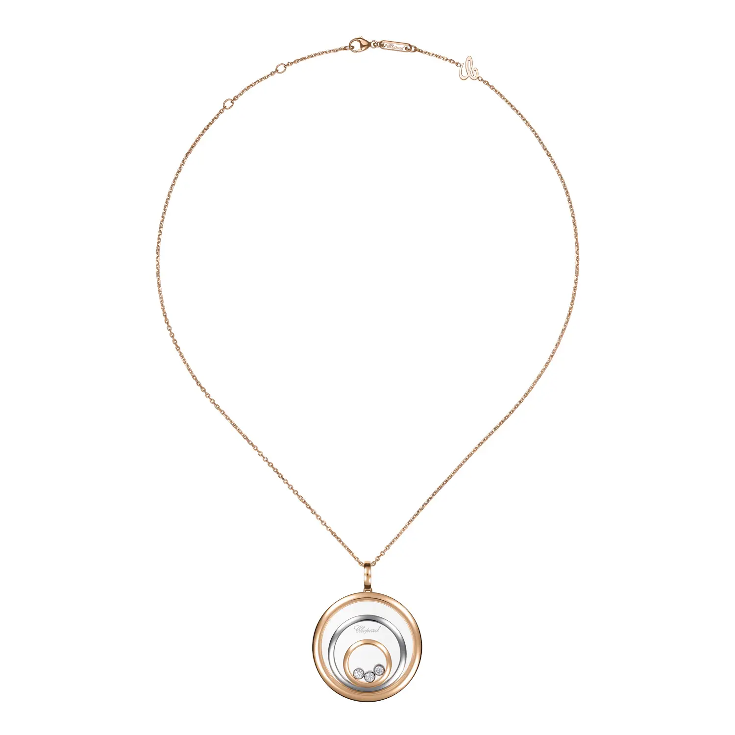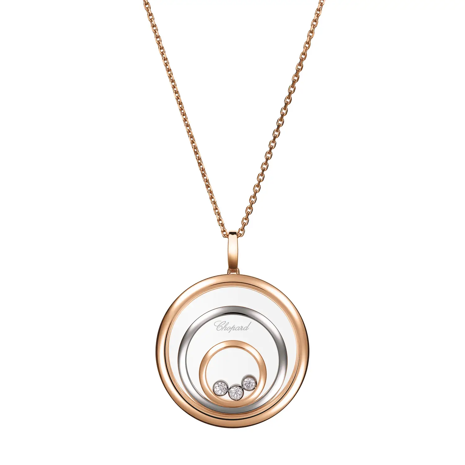 Der Chopard Happy Spirit 798232-9001 Anhänger ist eine Hommage an feminine Harmonie, Bewegung und Licht. Gefertigt aus einer Kombination von ethischem 18-karätigem Rosé- und Weißgold, verbindet er warme und kühle Töne zu einem zeitlos eleganten Erscheinungsbild. Im Zentrum tanzt ein freibeweglicher Diamant zwischen zwei Saphirgläsern, umgeben von konzentrischen Kreisen mit Diamanten von insgesamt 0,28 Karat – der ikonische „Happy Diamonds“-Effekt, Symbol für Freiheit und Lebensfreude.