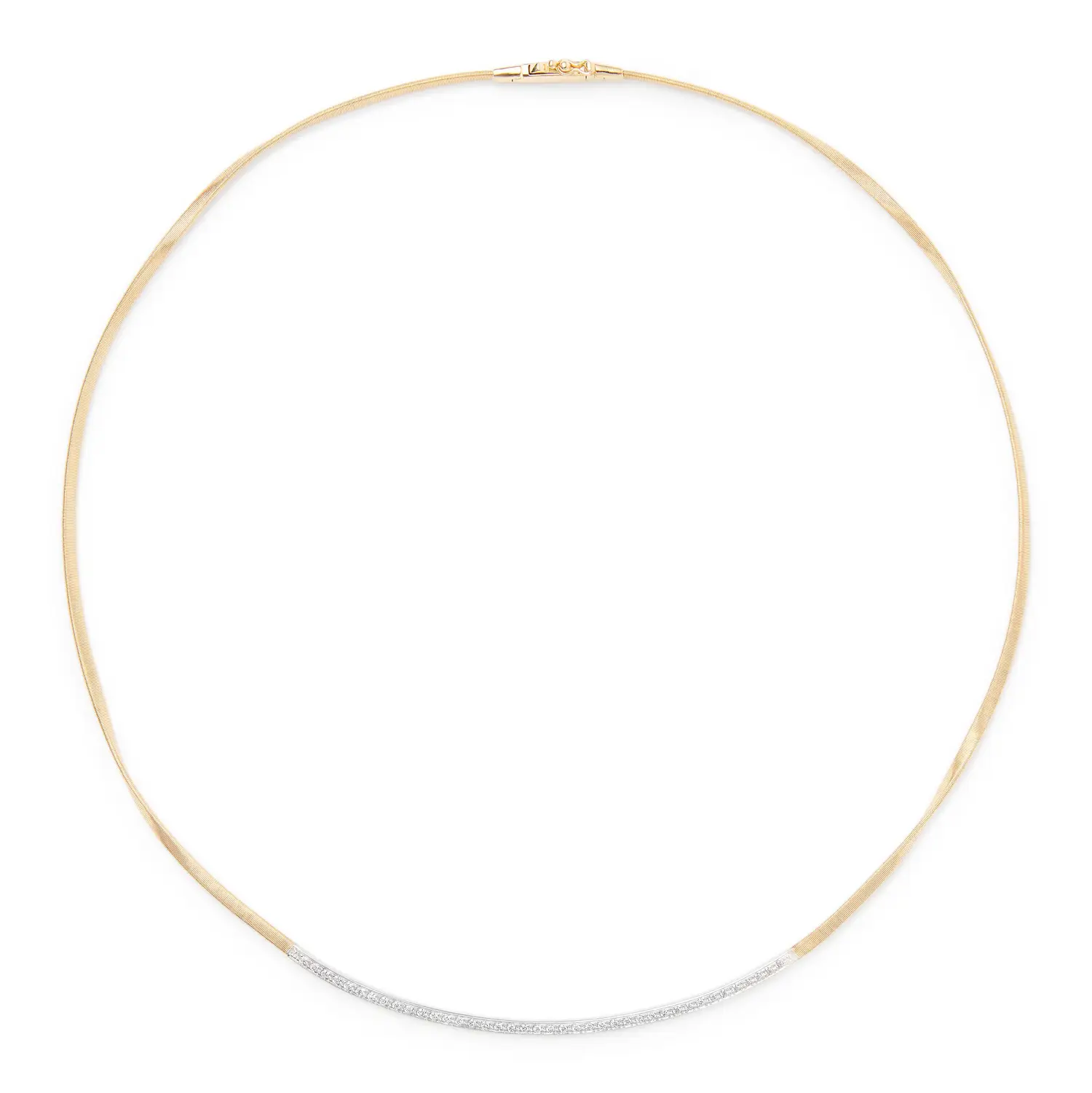 Diese luxuriöse Halskette aus der Marco Bicego Marrakech New-Kollektion besteht aus 18 kt kombiniertem Gold (750/1000) und besitzt eine elegante mattierte Oberfläche, die das charakteristische, handgewebt wirkende Gold der Marrakech-Linie hervorhebt. Mit einer Länge von 42 cm liegt sie perfekt am Dekolleté.