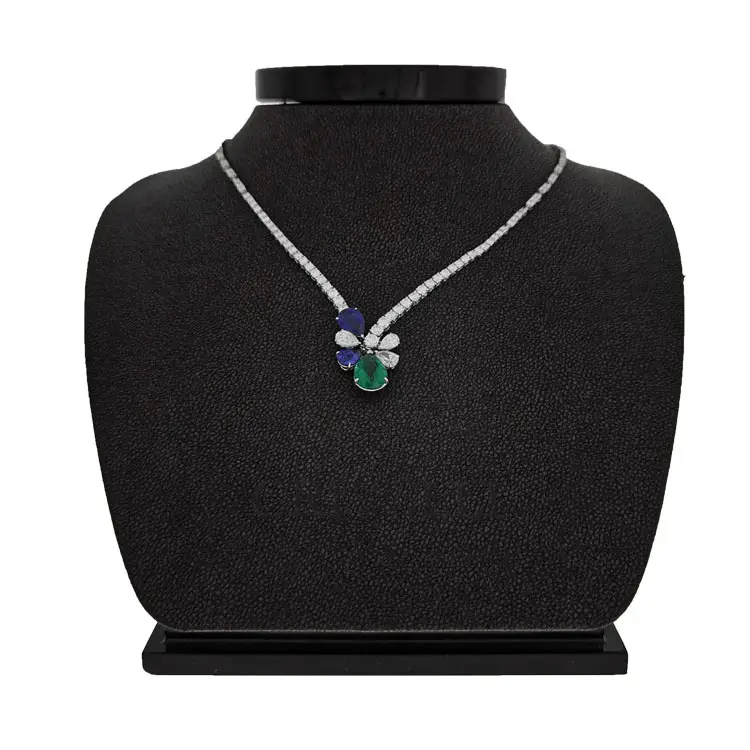 Im Mittelpunkt steht ein Smaragd, 2,38 ct (1 Stk.), sattgrün, natürlichen Ursprungs, ergänzt von einem Paar Saphire, 2,84 ct (2 Stk.), königsblau, natürlichen Ursprungs. Zusätzlichen Glanz verleihen natürliche Diamanten 1,22 ct (3 Stk.), Reinheit VS, Farbe F, sowie ein opulenter Rand aus 126 natürlichen Diamanten, 5,15 ct, Reinheit SI, Farbe F – gemeinsam unterstreichen sie die Tiefe der Farbsteine und den luxuriösen Charakter der Kette. Das Ergebnis ist eine zeitlose, feminine und strahlende Kette, die alle Blicke auf sich zieht.