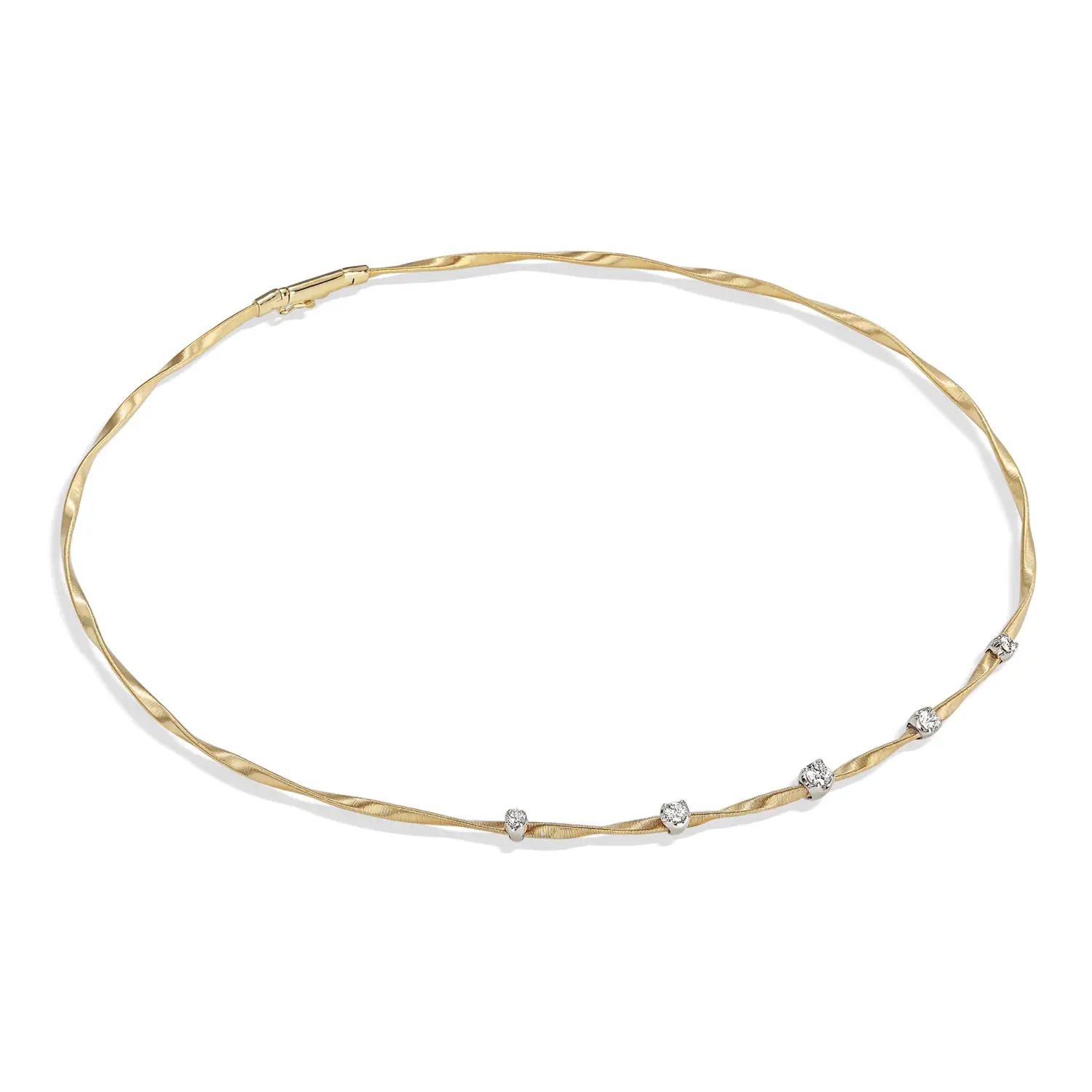 Diese edle Halskette aus der Marco Bicego Marrakech-Kollektion verbindet meisterhafte Handwerkskunst mit modernem Luxus. Sie besteht aus 18 kt kombiniertem Gold (750/1000) und besitzt eine glänzende Oberfläche, welche die kunstvoll gedrehten Goldfäden der Marrakech-Linie hervorhebt. Mit einer Länge von 41 cm liegt die Kette elegant am Dekolleté.