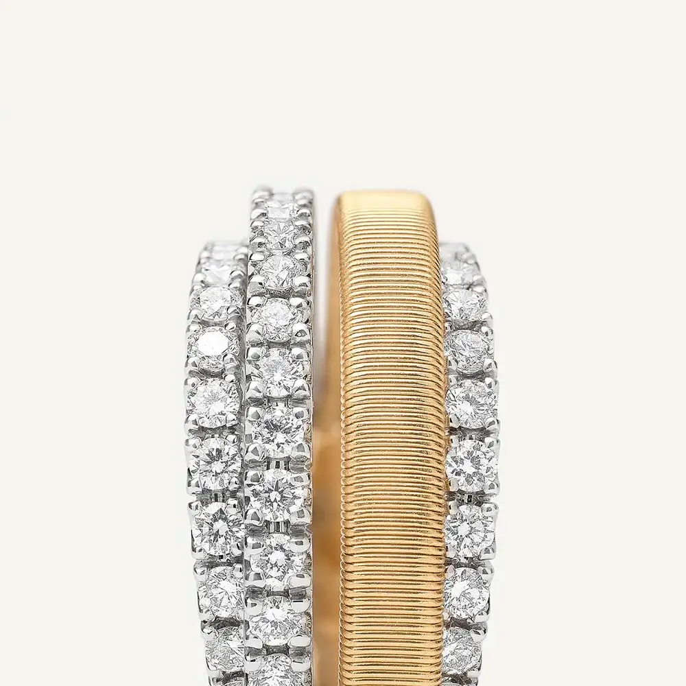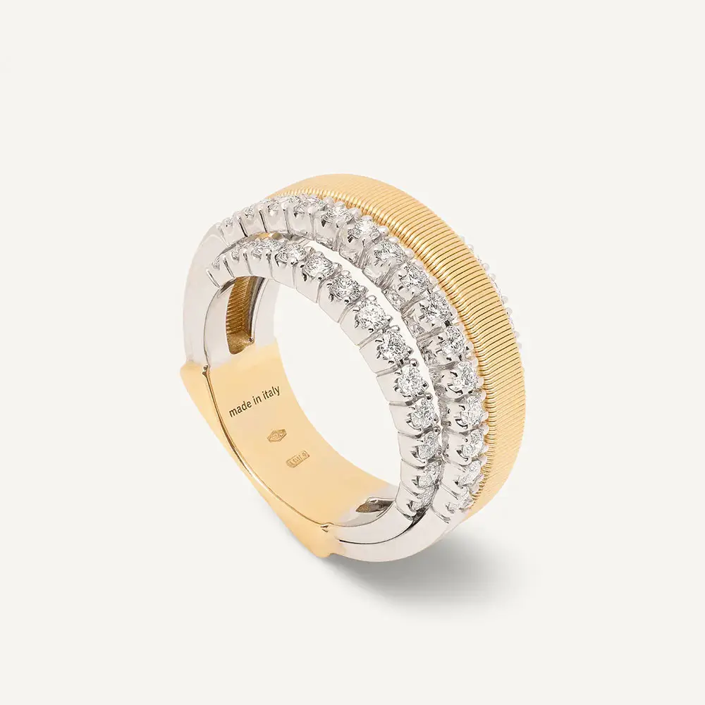 Der Marco Bicego Masai AG363 B2 YW M5 Ring verbindet markantes Design mit feinem Luxus. Gefertigt aus kombiniertem 18kt Gold (750/1000) und mit einer polierten Oberfläche, werden seine skulpturalen Linien und eleganten Kontraste betont.