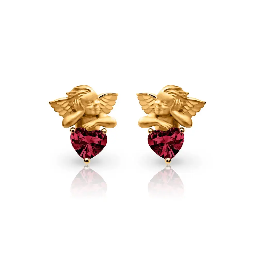 Im Mittelpunkt stehen zwei natürliche rote Granate in Herzform (Heart) — sie verleihen dem Schmuckstück Wärme und emotionale Bedeutung. Jeder Granat bildet einen reizvollen Kontrast zum Gold und betont das Designkonzept der My Angel Kollektion.