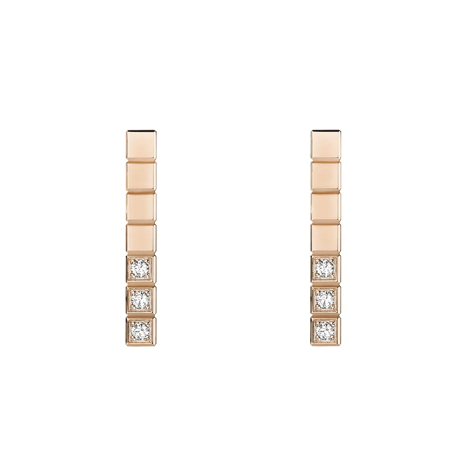 Die Chopard Ice Cube 837702-5002 Ohrringe verbinden modernen Minimalismus mit edlem Luxus. Gefertigt aus 18 Karat ethischem Roségold und besetzt mit sechs Brillanten von insgesamt 0,06 ct, spiegeln sie das charakteristische kubische Design der Kollektion wider, inspiriert von Eiskristallen.
