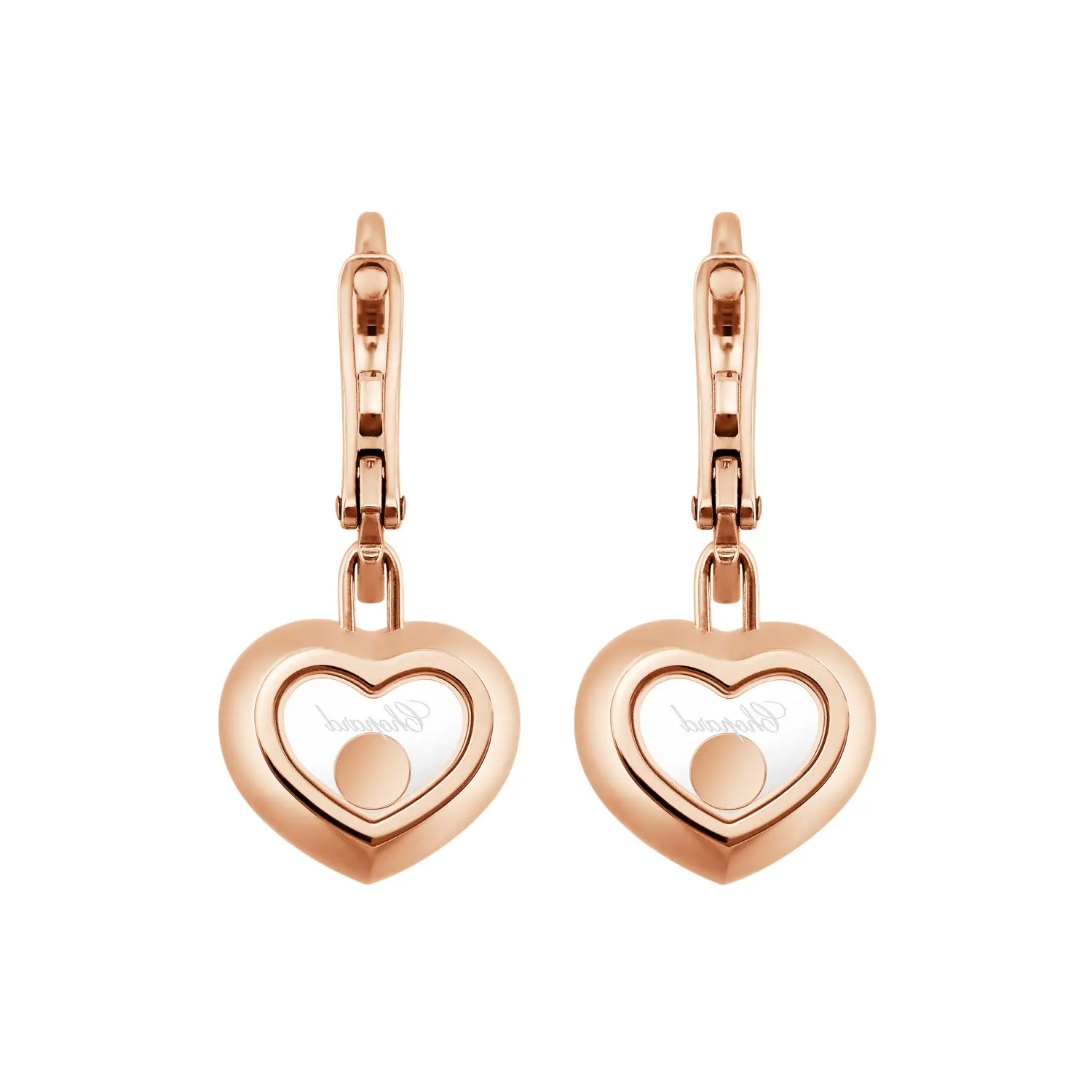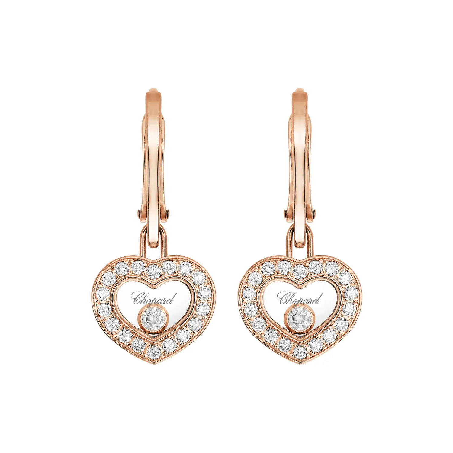 Die Chopard Happy Diamonds Icons 83A054-5401 Ohrringe verkörpern die ikonische Schönheit und Lebensfreude, die die Happy Diamonds Kollektion auszeichnen. Gefertigt aus ethischem 18-karätigem Roségold, zeigen sie frei bewegliche Diamanten, die zwischen zwei Saphirgläsern tanzen und bei jeder Bewegung funkeln. Das Gesamtgewicht der Diamanten beträgt etwa 0,38 ct.