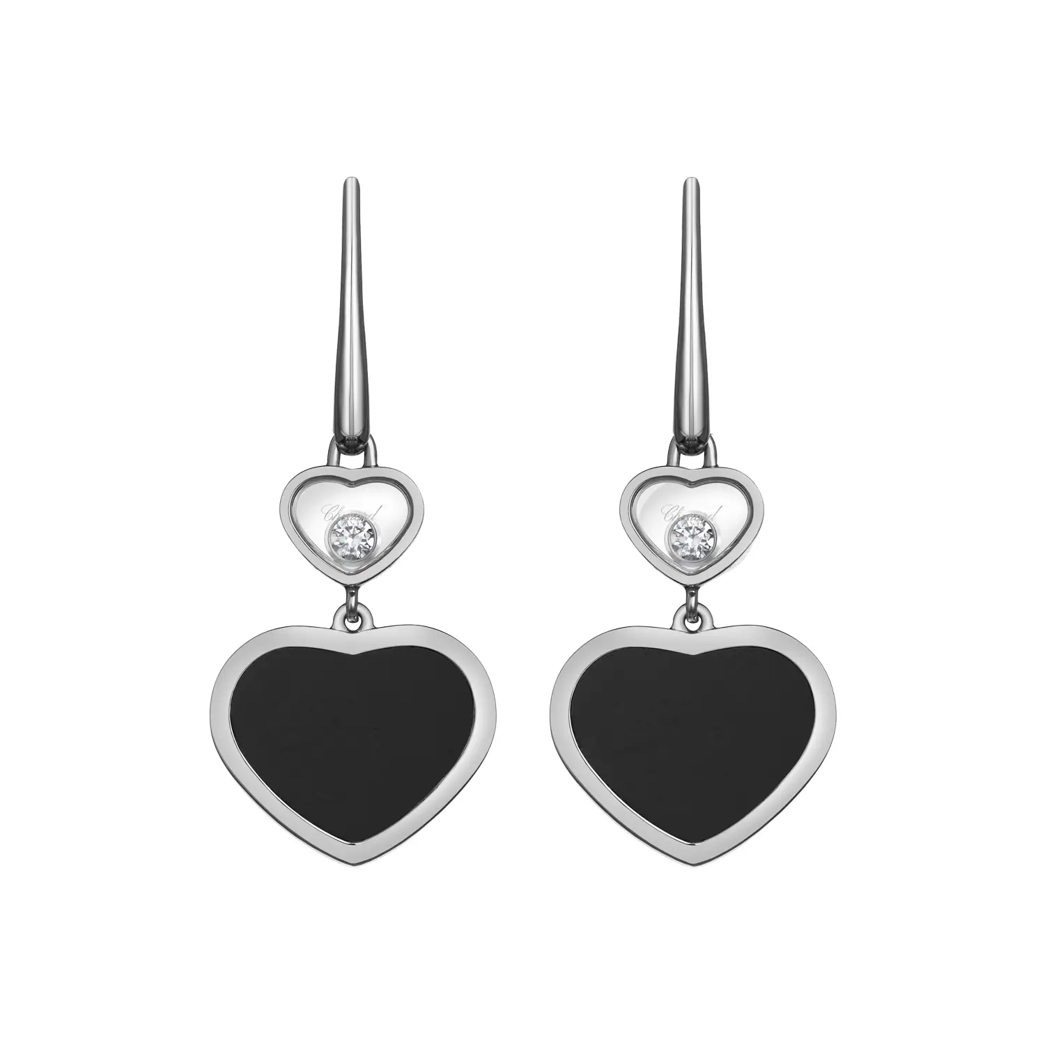 Die Chopard Happy Hearts 837482-1210 Ohrringe vereinen die Symbolik von Liebe und Glück mit zeitloser Eleganz. Gefertigt aus 18 Karat Weißgold, sind sie mit Onyx-Herzen und Brillanten (insgesamt ca. 0,10 ct) verziert, die sich frei im Inneren bewegen – das ikonische „tanzende Diamanten“-Motiv, Symbol für Freiheit und Lebensfreude.