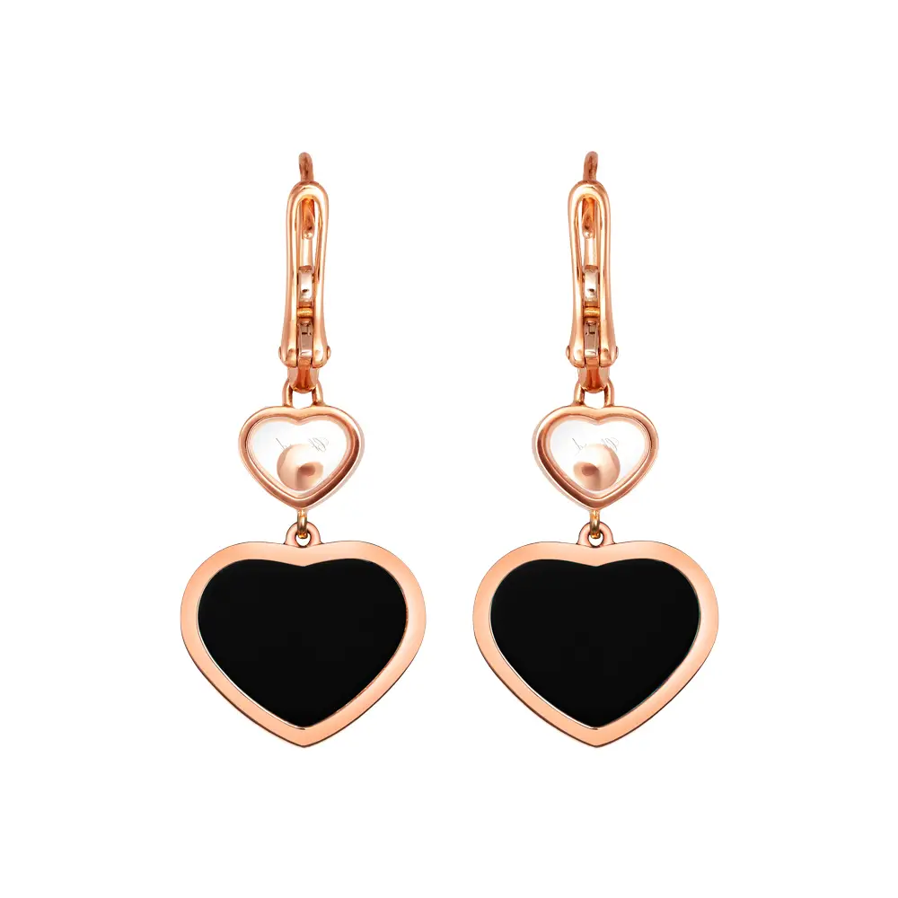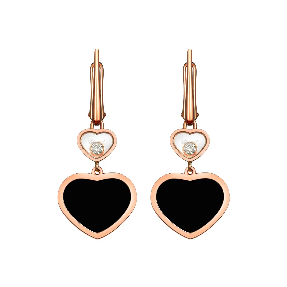 Im Zentrum der Komposition steht natürlicher Onyx (2 Stück) in Herzform / Heart, tiefschwarz (Herkunft: natürlich), der einen eleganten Kontrast zum Roségold bildet. Für zusätzlichen Glanz sorgen natürliche Diamanten 0,10 ct (2 Steine) im runden Schliff / Round, weiß, mit Reinheit IF–VVS und Farbe F–G. Die präzise Fassung betont die Brillanz der Steine und die Klarheit der Linien – zeitlose, feminine und ausdrucksstarke Ohrringe, die sich mühelos mit weiterem Chopard-Schmuck kombinieren lassen.