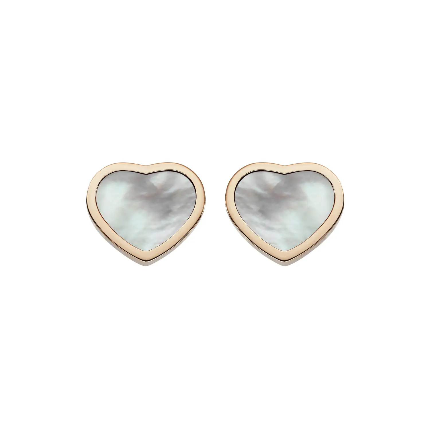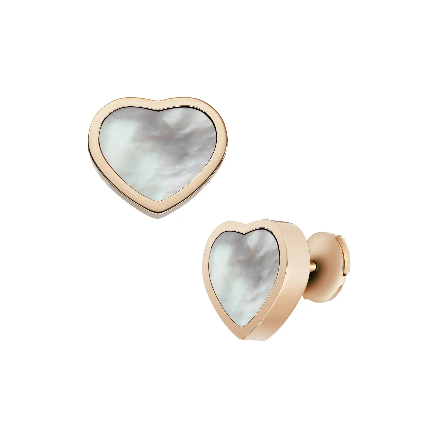 Die Chopard Happy Hearts 839482-5301 Ohrringe vereinen romantisches Design mit dezentem Luxus. Gefertigt aus 18 Karat Roségold, sind sie mit zwei weißen Perlmutt-Herzen verziert, die sanft schimmern und Reinheit sowie Weiblichkeit symbolisieren – ein charakteristisches Motiv der Happy Hearts Kollektion. Jedes Detail spiegelt die Freude und Eleganz der Marke Chopard wider.