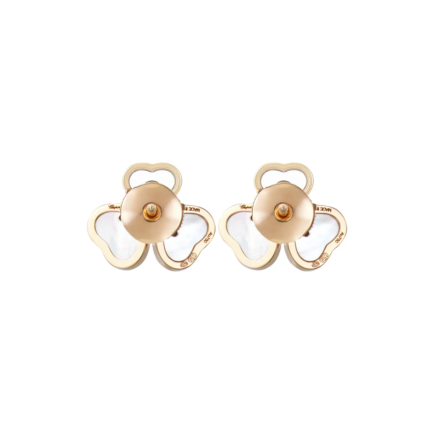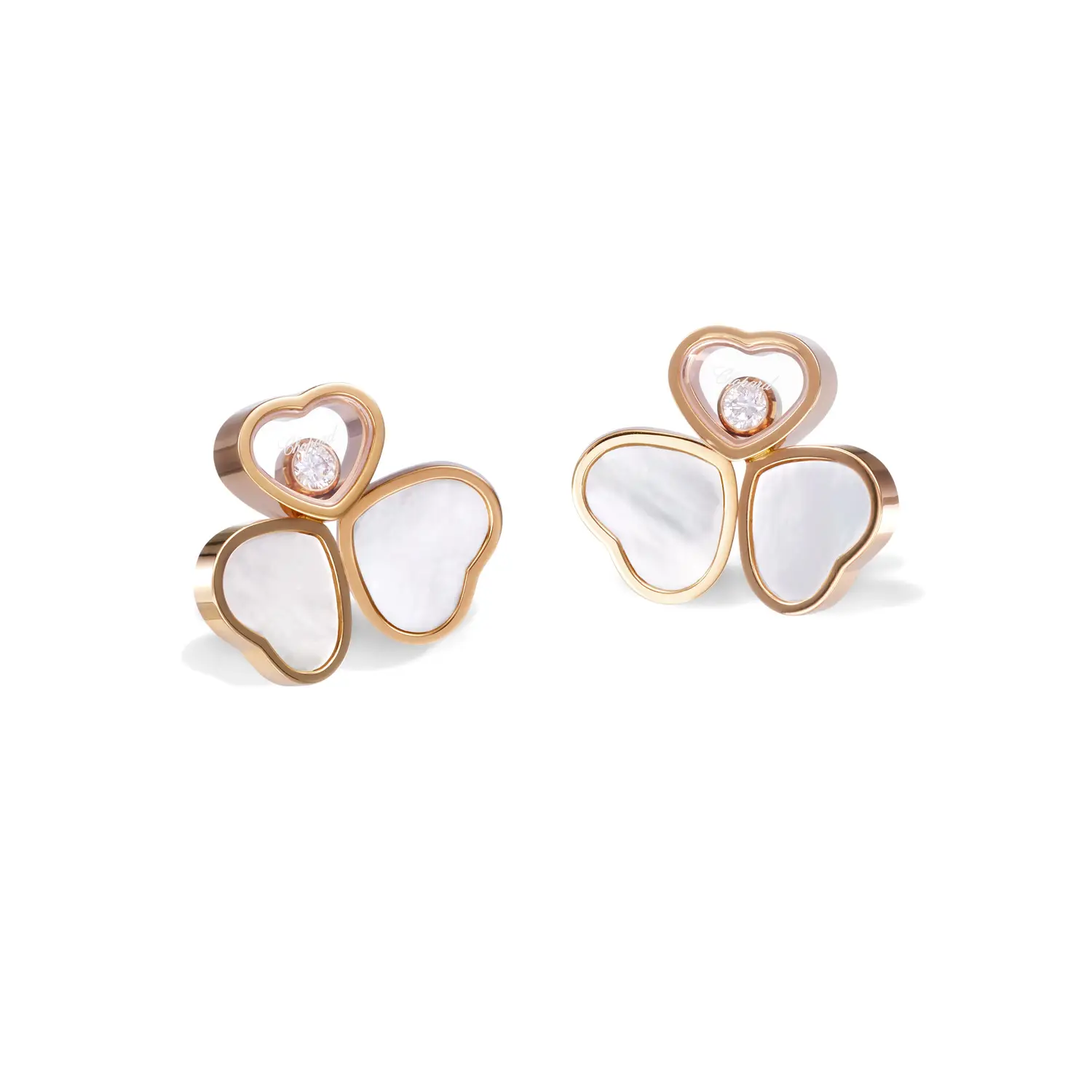Die Chopard Happy Hearts Wings 83A083-5301 Ohrringe verkörpern Leichtigkeit, Freiheit und feminine Eleganz. Gefertigt aus 18 Karat ethischem Roségold, sind sie mit Brillanten (insgesamt ca. 0,10 ct) und weißen Perlmutt-Herzen verziert, die als zarte Schmetterlingsflügel gestaltet sind – Symbol für Freude und Freiheit.