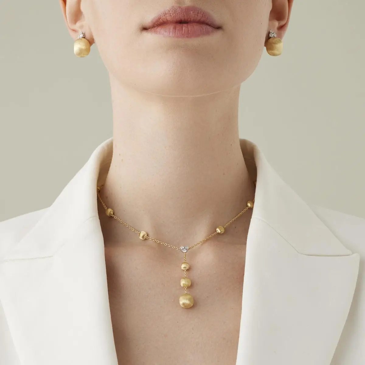 Jedes Stück wird aus 18kt Gold gefertigt und mit der Bulino-Technik von Hand graviert, wodurch es eine sanft matte, samtige Oberfläche erhält. Typisch sind große kugelförmige Elemente, deren minimalistische Form Reinheit und Eleganz unterstreicht. Africa ist erhältlich als Halsketten, Armbänder, Ringe und Ohrringe, oft veredelt mit Diamanten oder farbigen Edelsteinen.