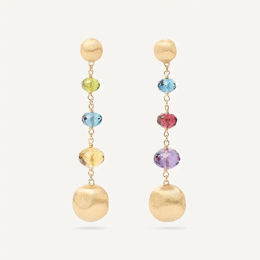 Die Marco Bicego Africa OB1625 MIX02 Y Ohrringe vereinen farbliche Vielfalt, feines Design und kunstvolles Goldhandwerk. Sie bestehen aus Gelbgold 18 kt (750/1000) mit einer matten Oberfläche, die die lebhaften Edelsteine dezent ins Licht rückt. Der Verschluss erfolgt durch Puzeta (Stecker) und sorgt für komfortablen und unauffälligen Sitz.