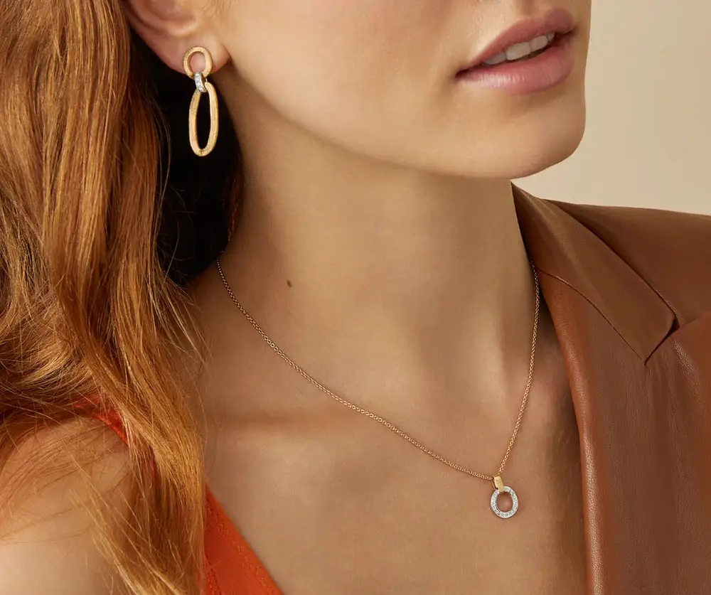 Die goldenen Ohrringe mit Diamanten der italienischen Marke Marco Bicego mit ihrem modernen, verspielten Look verleihen Ihrem Outfit den letzten Schliff. Sie werden die Schönheit jeder Frau unterstreichen, die ihre Eleganz und ihre feminine Seite betonen möchte. Sie werden den Luxusschmuck der Jaipur-Kollektion lieben, wenn Sie Luxus und hochwertige Verarbeitung bevorzugen. Die goldenen Ohrringe mit Knopfverschluss aus 18 Karat Gelb- und Weißgold sind mit runden natürlichen Diamanten in weißer Farbe besetzt.