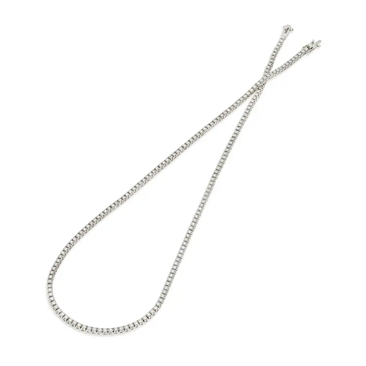 Die Halskette ist mit natürlichen weißen Diamanten im Rundschliff (Round) besetzt, mit einem Gesamtgewicht von 12,90 Karat, einer Farbe G–H und einer Reinheit VS. Jeder einzelne Diamant wird präzise von Hand gefasst, um eine kontinuierliche Linie aus Licht und Glanz zu schaffen, die den Hals in funkelnde Eleganz hüllt.